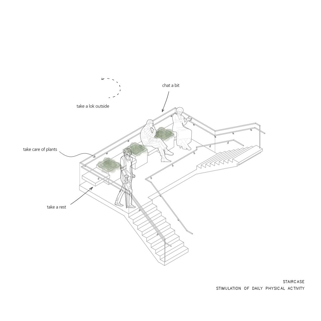 The design of staircases means to increase the amount of physical activity among seniors in the simplest way. On each landing, they are furniture to rest on. That encourages residents to use the stairs more often without getting too tired. Additionally, staircases are glazed and the main view is directed towards the atrium.