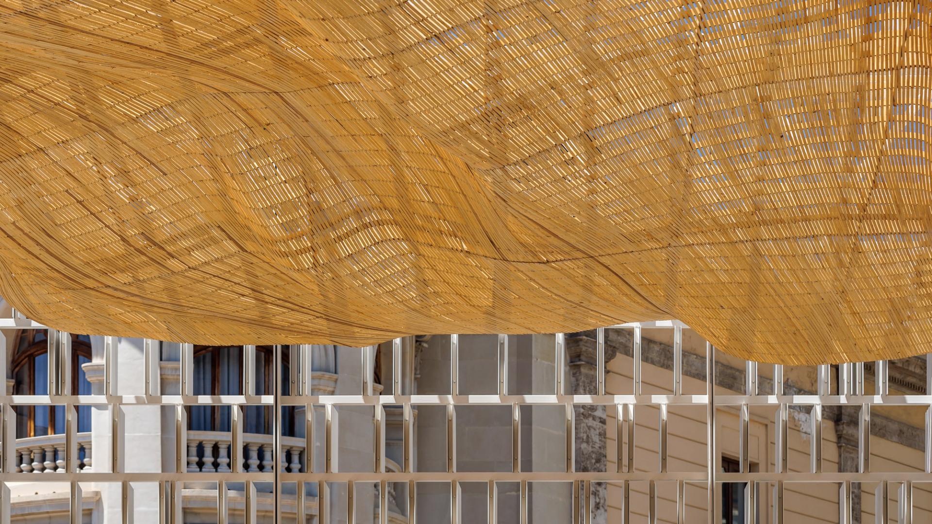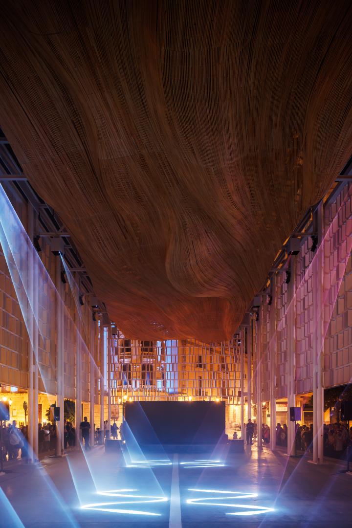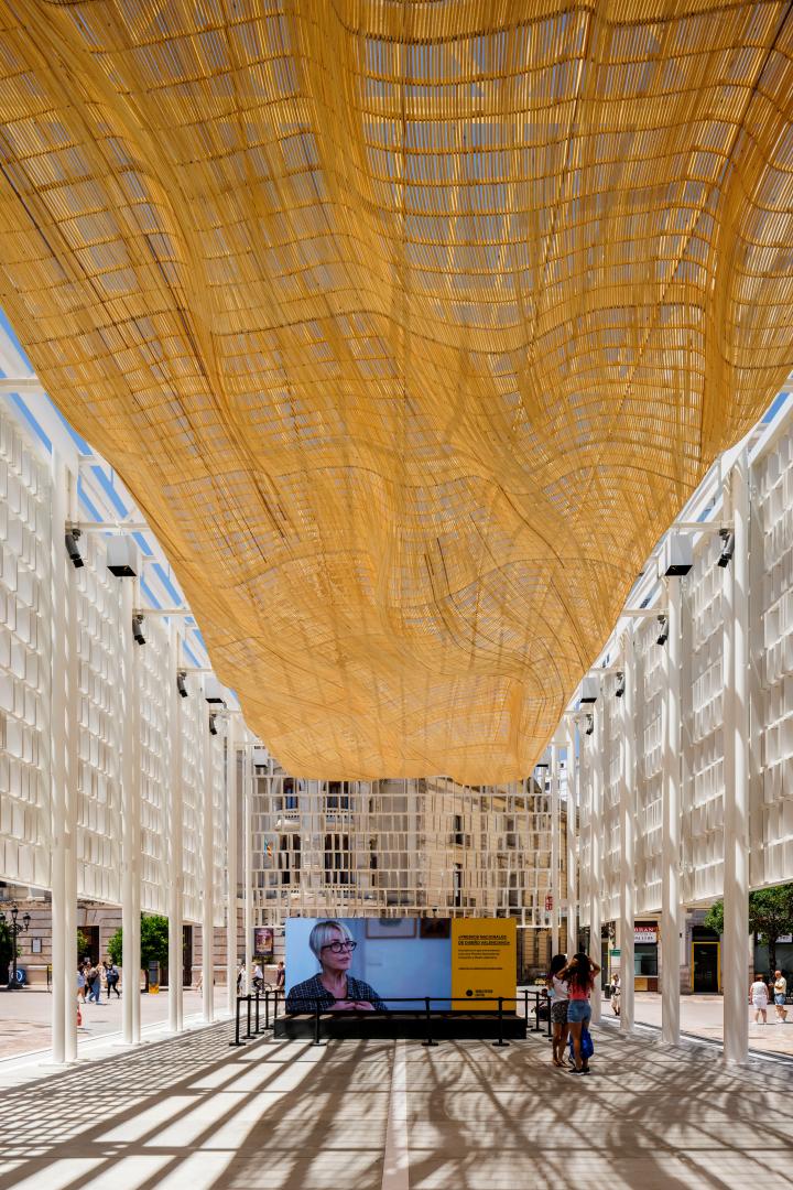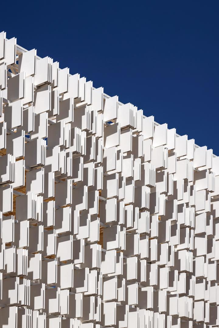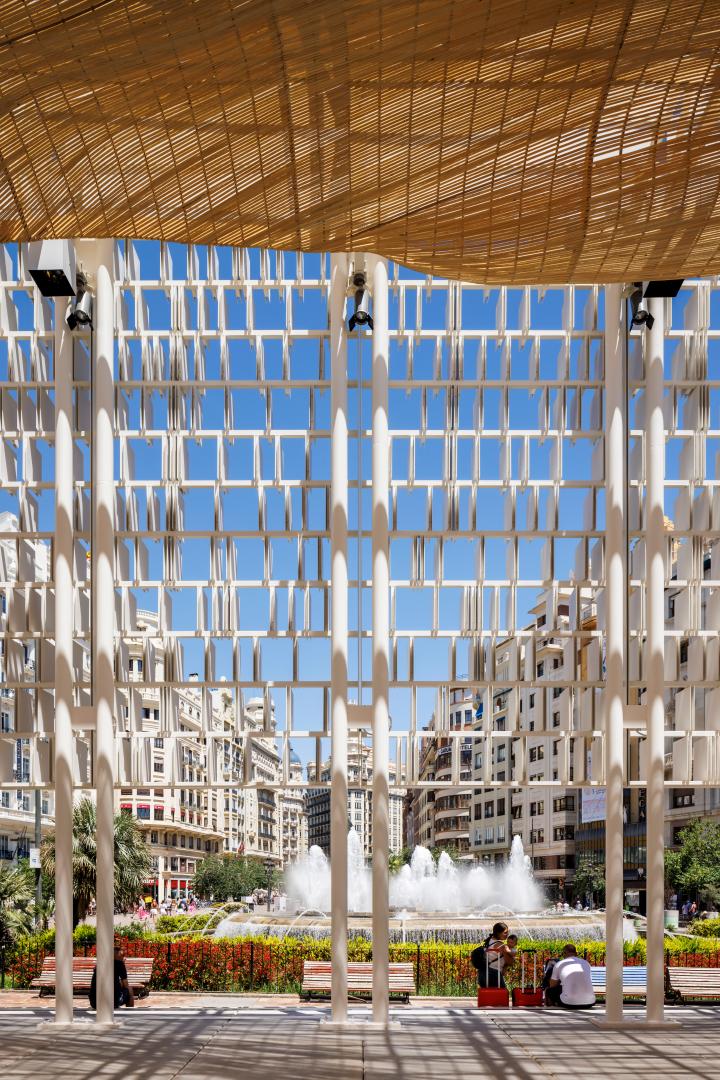 With a surface area of 350 square metres, this modular pavilion tells the story of the renowned design born on the shores of the Mediterranean, of materials arising from ceramic innovation and of traditions such as the vareta. The building is covered with a skin developed by the companies Inalco and Wandegar from pieces of MDI placed perpendicularly on the façade to filter the light as the hours go by. In fact, the light has been treated as just another construction material, and other elements such as the aesthetically powerful upper roof also contribute to this. The piece of wickerwork that tops the pavilion is made by Manolo García, a master carpenter and Fallas artist. This element simulates the waves of the Mediterranean Sea in reference to the city as a historical point of union between cultures.