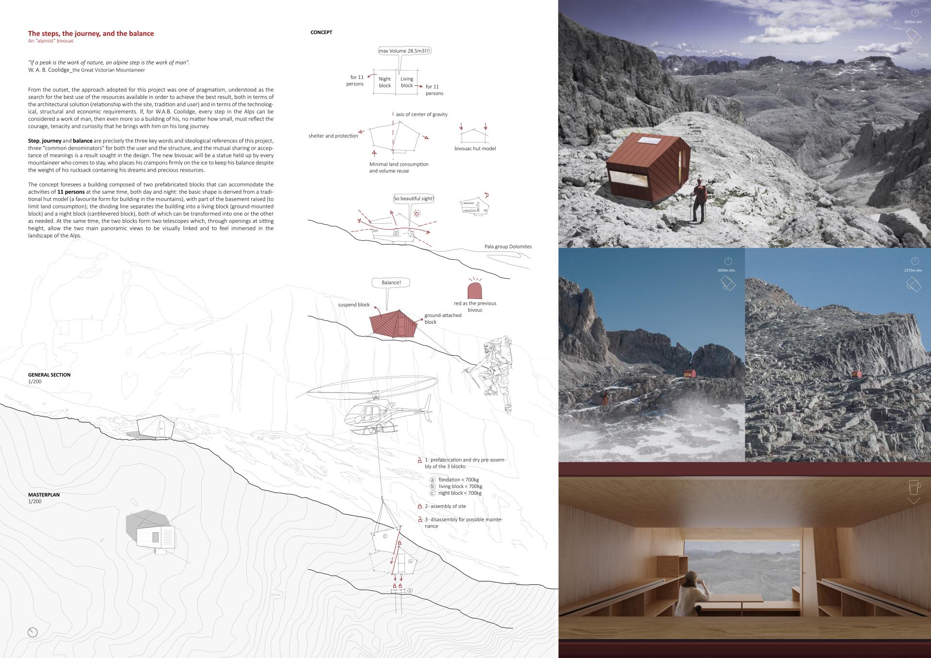 The bivouac is a very small anthropic point in the middle of the climbing route. The concept is to replace the old bivouac with a new model that responds to the relationship between nature and the Alps, architecture and the bivouac, and between the mountaineer and his steps, his journey and his search for balance. It envisages a volume composed of two prefabricated blocks to accommodate 11 people, its construction technology contributing to reduce its impact on natural sites and construction pol