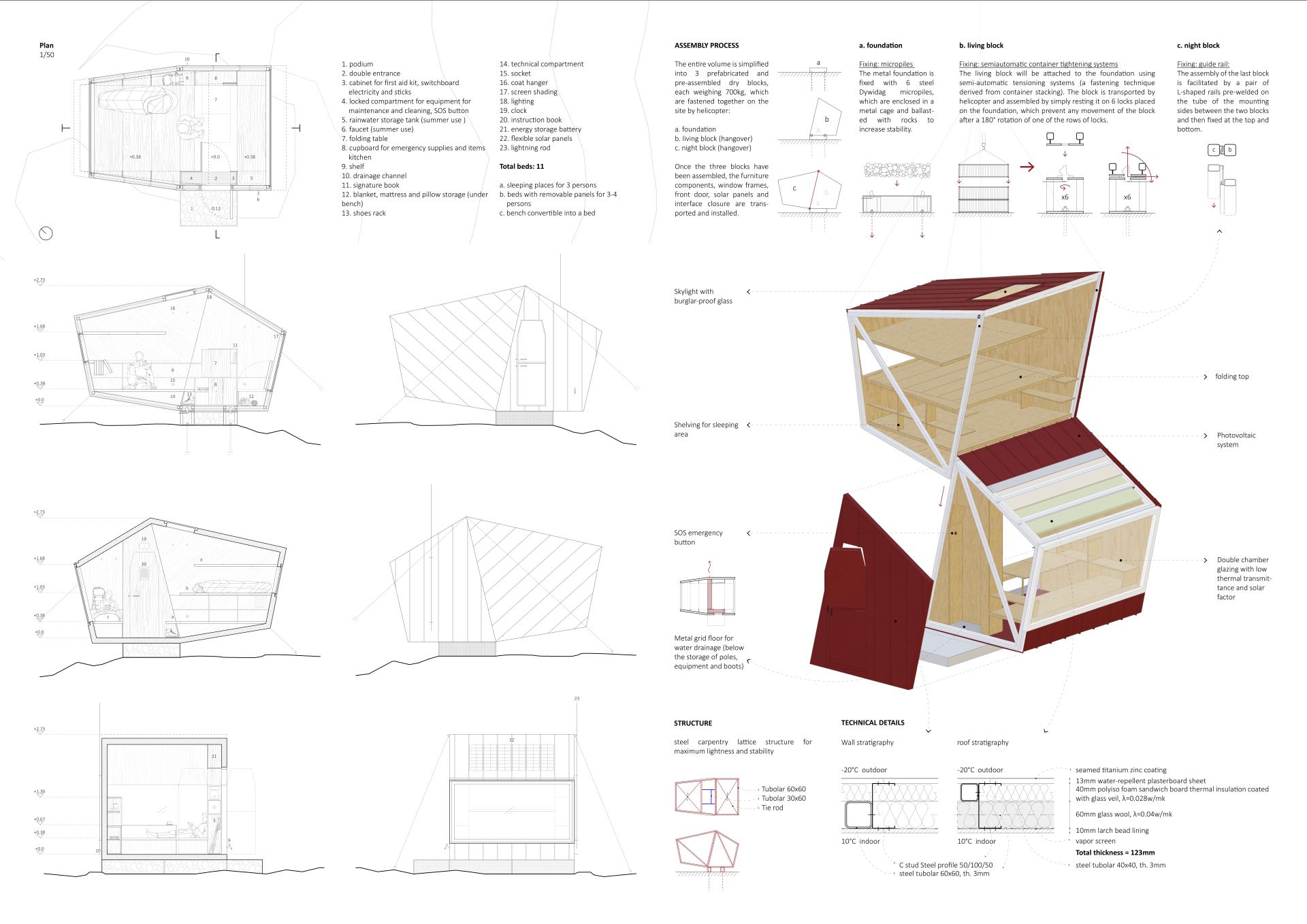 The entire volume is simplified into 3 prefabricated and pre-assembled dry blocks, each weighing 700kg, which are fastened together on the site by helicopter: first the metal foundation, then the residential block, and finally the night block.