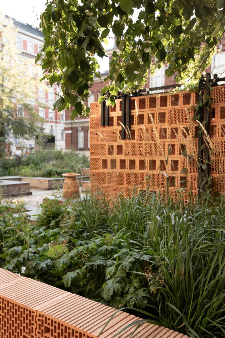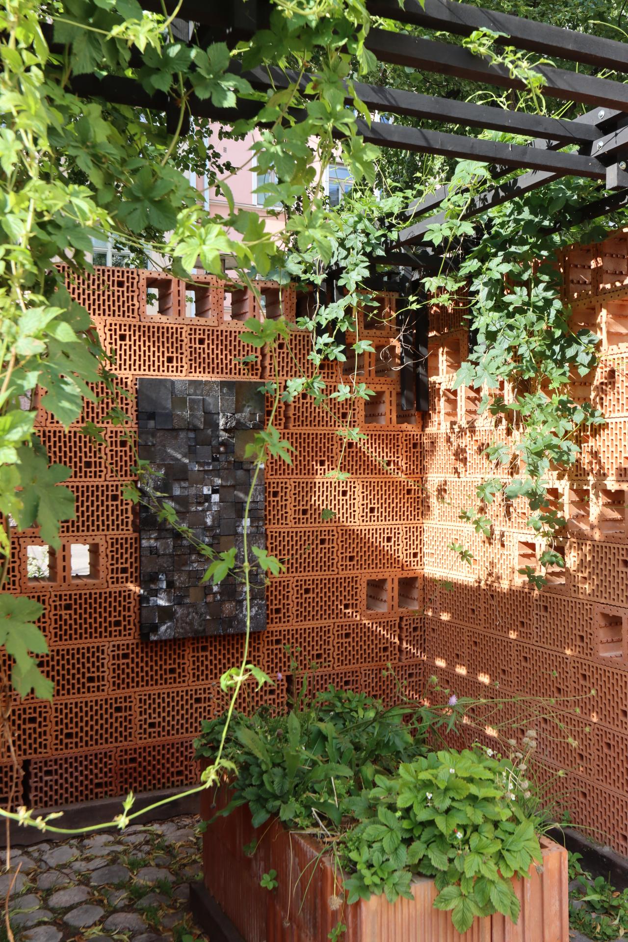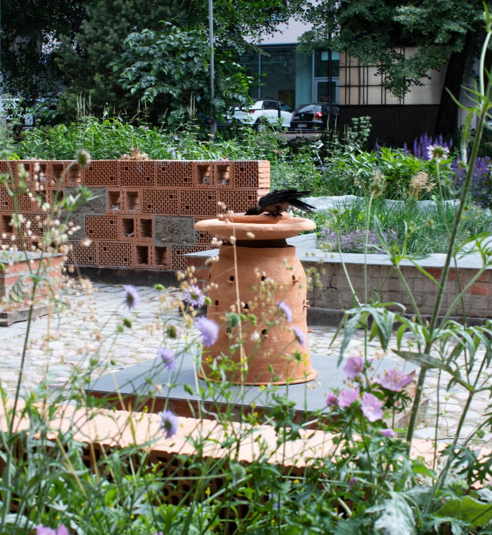The space is formed with raw and fired clay, wood, and transient plant life. Its decaying wood blocks, porous clay structures, and pollinator-friendly plantings offer shelter and nutrition for insects and birds in a densely built urban environment. Fungi and biochar take part in caring for the soil. Flowering perennials create a calm and restorative space for people to open to different ways of being alive of the more than human community.
