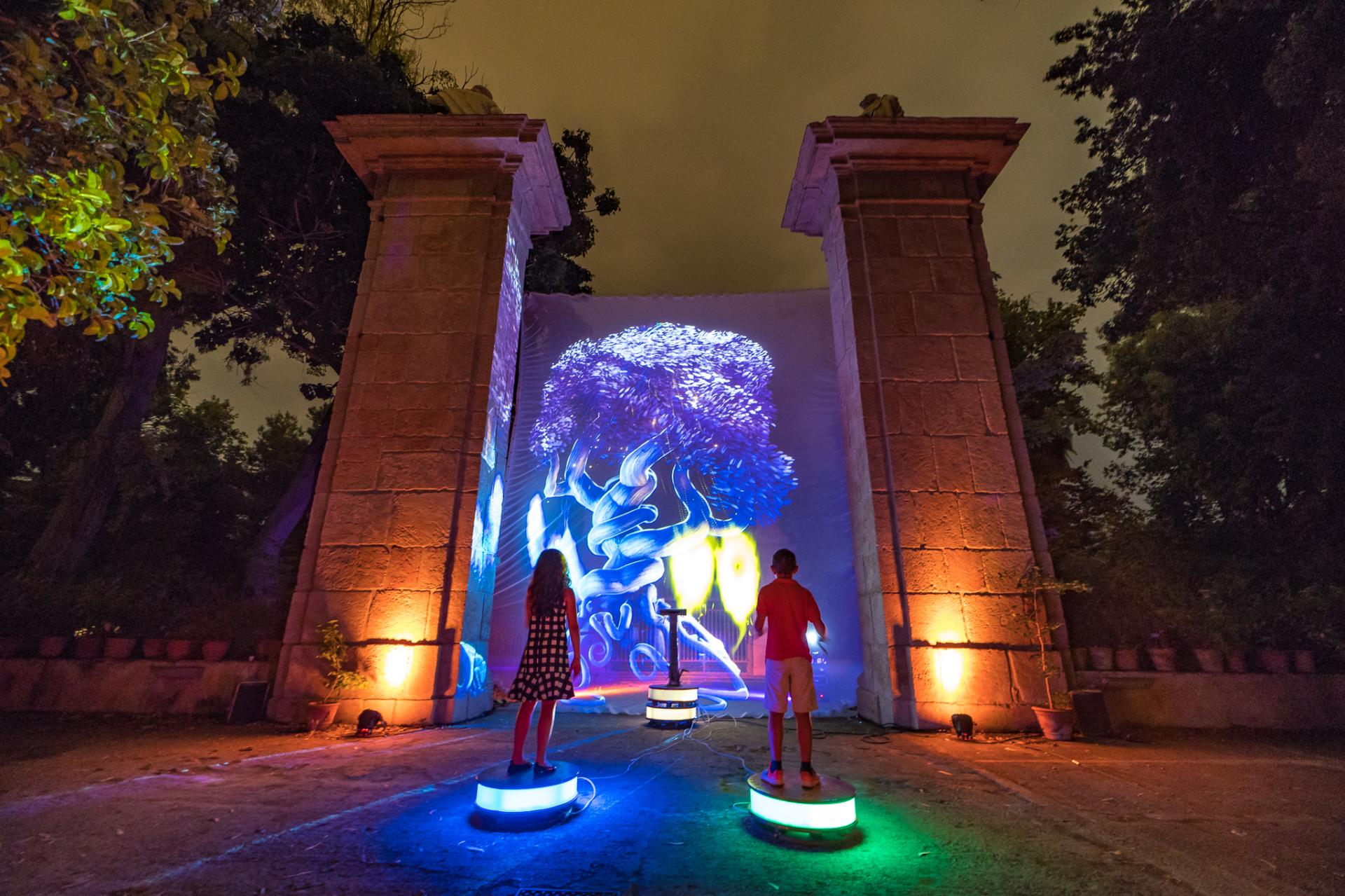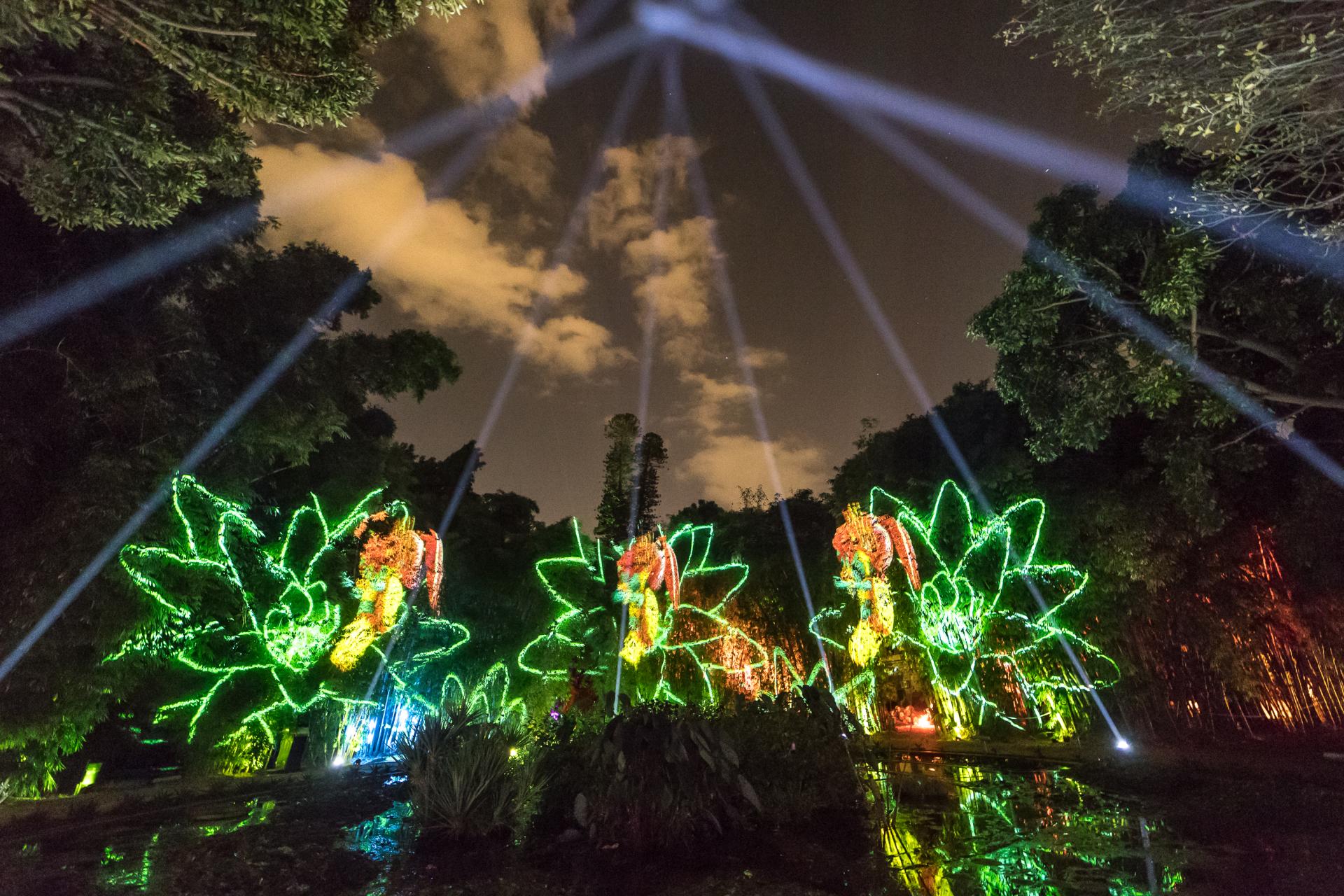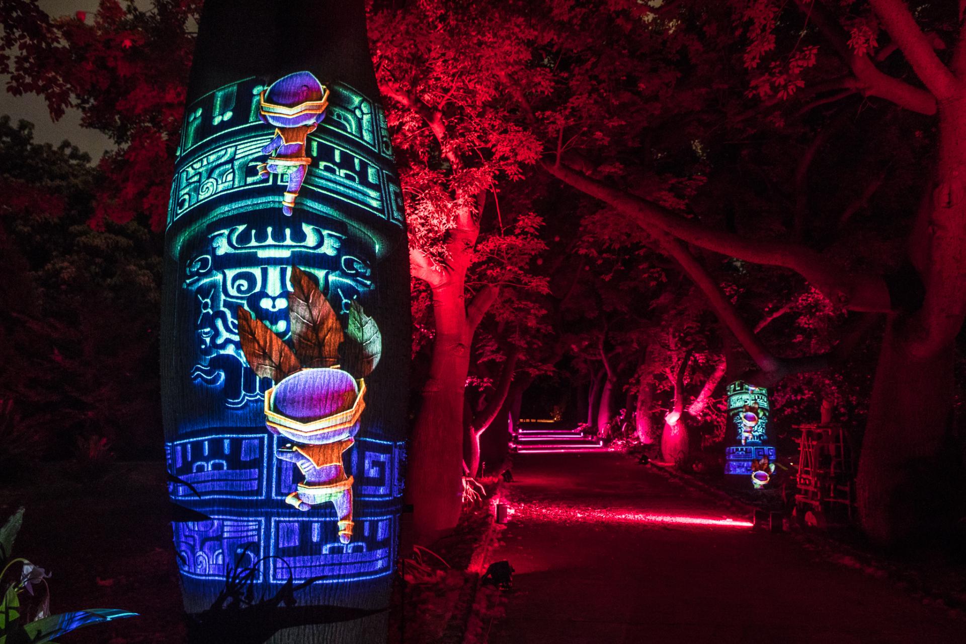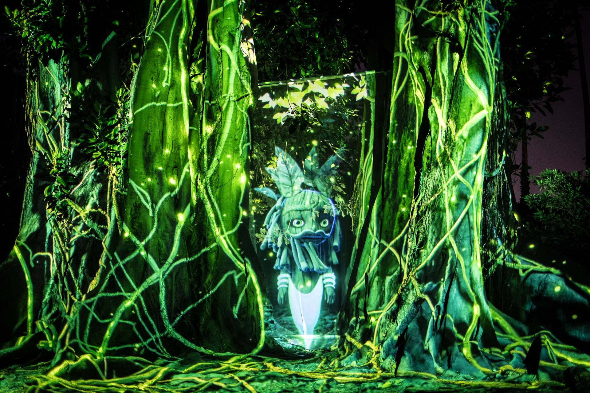 Throughout the entire journey, visitors will get in touch with the creatures of light like Jinn, an holographic avatar of the Genius of Palermo, a mythological figure who personifies the various cultures converging in the city; Puch (based on Ah-Puch) linked to the Ceibe, tree of life for Mesoamerican cultures; Sun (Sun WuKong King of the Apes celebrated by tales throughout the East), shown on the bamboos; Yara (the aboriginal Yara-ma-yha-who) which put her evolutions on the branches of the big Moreton Bay fig (Ficus macrophylla), and also Kurma, avatar of Visnu, that can be found at the lotus flower pool.
