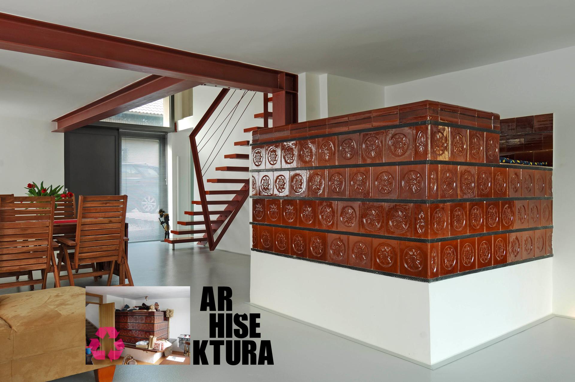 On eastern façade of house, a carport and a large terrace accessible from children's apartment on first floor are added. Large bright flowing living spaces on garden floor. It is dominated by a preserved tiled stove. Old heating element provides most comfortable warmth and connects past with future. Light modern wooden staircase, is a beautiful accessory to overlooking dining room. Large facades glazing provide plenty of sunlight inside. On garden ground floor, we sit in cool shade in summer under hanging tree - artificial pergola. Economic & sustainable use of materials ensure a sophisticated appearance and reflect pulse of modern life. Space mean furnishing space with indispensable things, from a bicycle, favourite playground or chair. Feeling in living structure is enjoying being among everyday useful elements and bespoke aesthetics of architectural elements. Flexibility of space; a house renovated into a dynamic body - wall moves to where it is needed, windows are not holes in wall, but a simultaneous system of natural and artificial light. Living space is a reflection of things we like - airy bright spaces, variety of furniture elements, different layouts when we want to change those. In an era of Climate & Biodiversity Crisis, design of recycled House 4002 make us comfortable, safe and healthy.