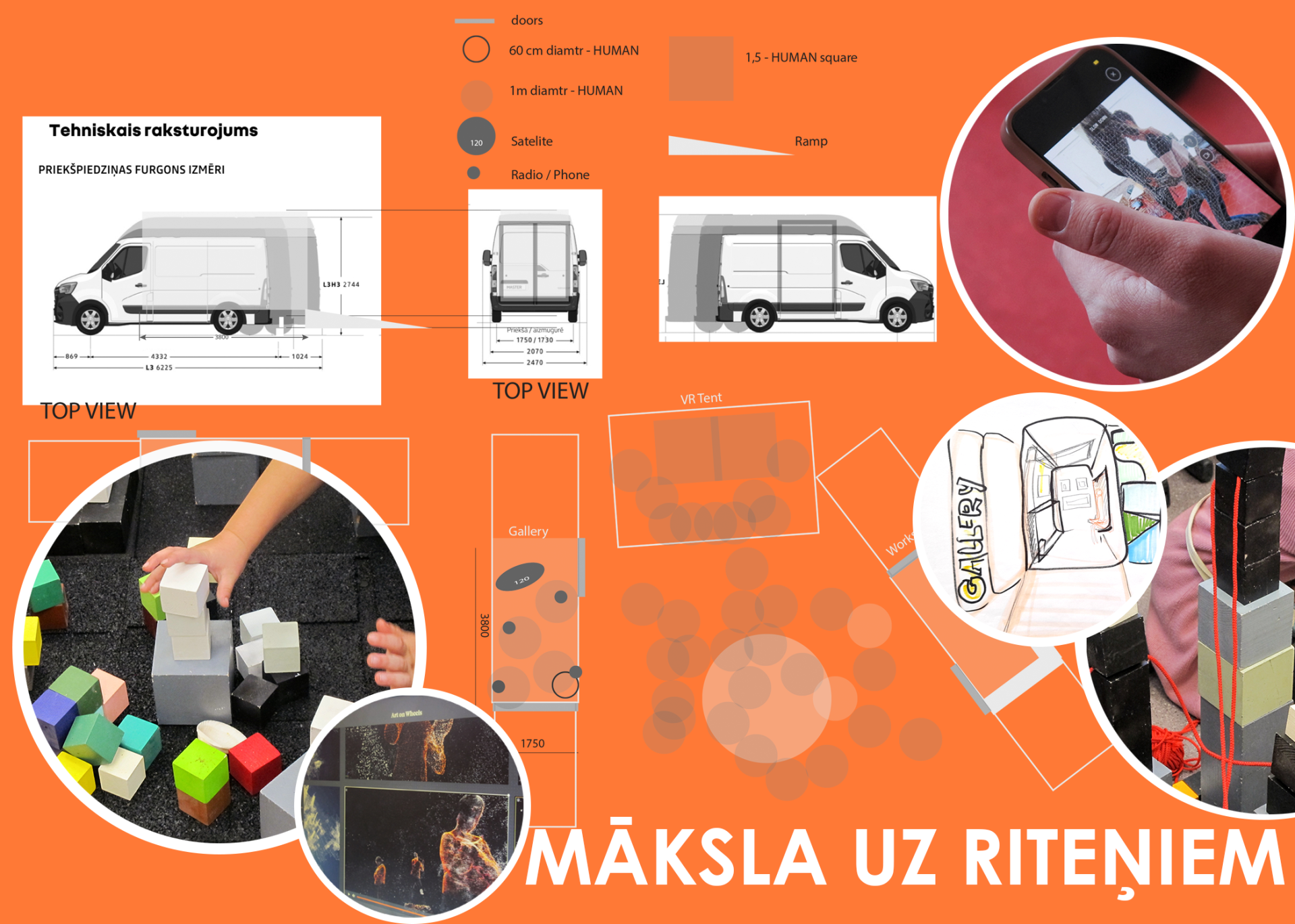 “Art on Wheels” is a traveling contemporary art exhibition that is located in two minivans. It is a unique approach to bringing art to places outside the capital that do not have the necessary venues for hosting contemporary culture and suffer from an overall lack of infrastructure that would connect rural regions to the capital city Riga. This approach to exhibition organization was chosen with consideration of accessibility and simplicity to promote inclusivity and equal possibilities to access important social and cultural events that provide learning opportunities.