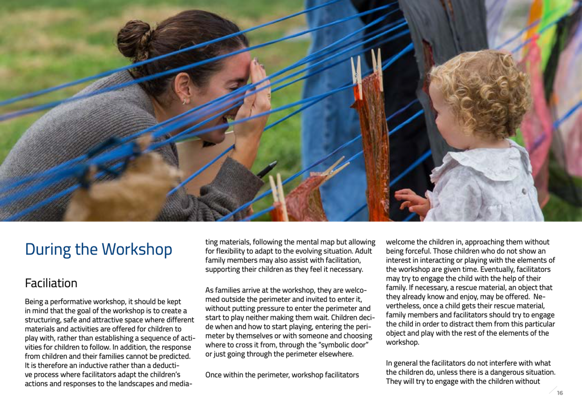 The project methodology was organised in three independent but interconnected stages: A preparation phase, the workshops, and the analysis and output production phase. The preparation phase created a knowledge base through a review of the latest literature, also including policies and initiatives, and visits with autistic children and their families to local parks that allowed the team to observe them play and discuss their needs and demands with their families. This information was instrumental to design our performative co-creation methodology that was tested in four where a temporary installation was created that offered a wide diversity of play opportunities for children to engage with. Being performative workshops, there was no prescribed sequence of activities to be followed but facilitators adapted to the children’s actions and responses to the temporary installations. These workshops allowed the team to collect primary data through systematic observation and informal interviews with participants. In the last project phase, we analysed data collected through the different research activities and extracted initial results. These were validated and enriched through group discussion sessions with participants and experts to develop the Co-creation Guide and the Design Handbook.