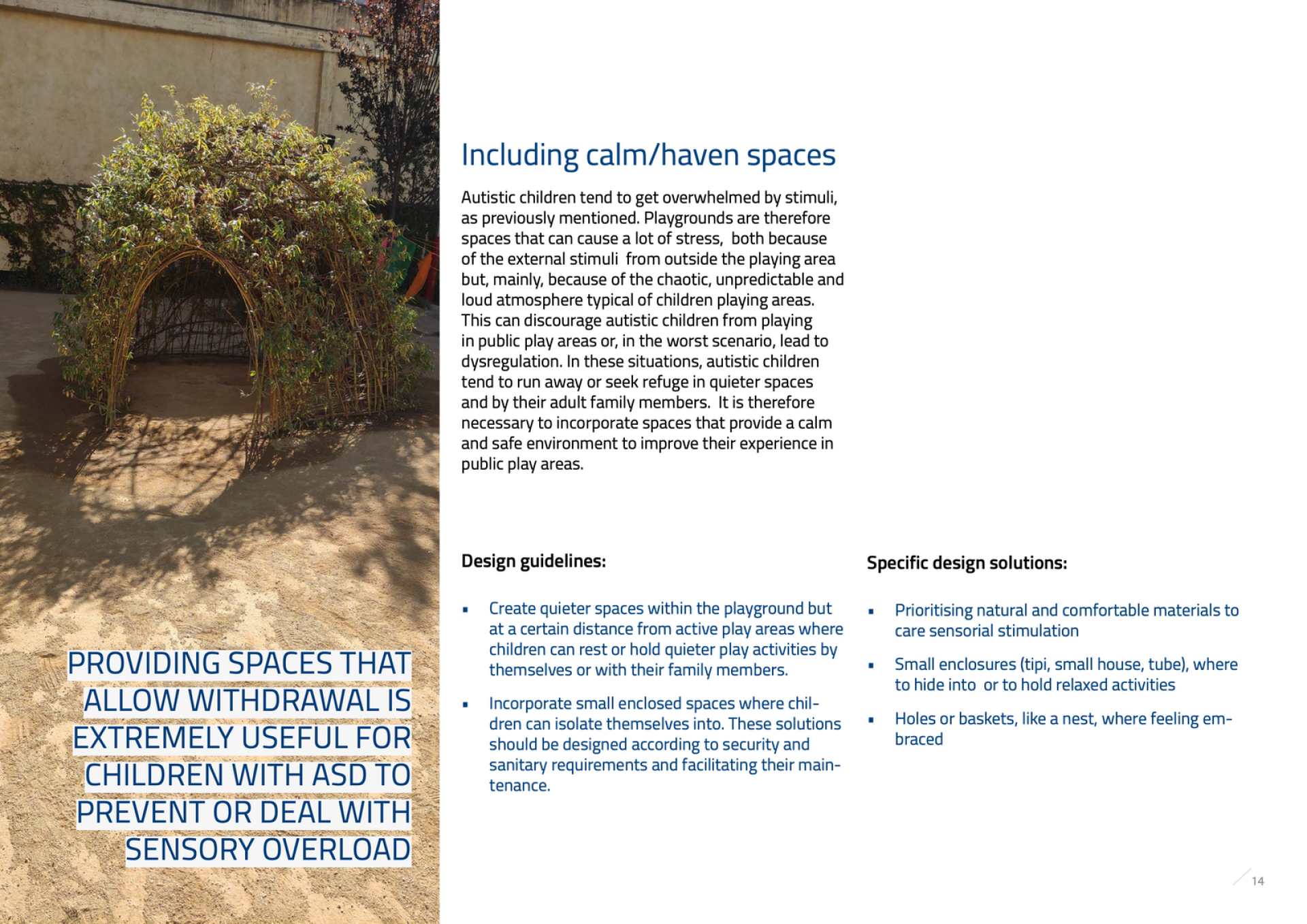 First, by granting the ASD Community access to public playgrounds and ensuring that their experience of this space was a pleasant one. The design of universally accessible play areas almost exclusively focus on physical and visual disabilities and do not sufficiently address the challenges related to neurodiversity. The needs of autistic people are indeed simultaneously unique both in terms of covering a wide range of needs and high levels of variability among autistic people. This, combined with the lack of knowledge among urban practitioners and policymakers results in their exclusion from public space. Our Design Handbook equips practitioners and policymakers with knowledge and tools to ensure that autistic children can fully enjoy their right to play in public playgrounds.