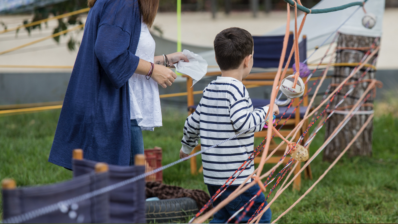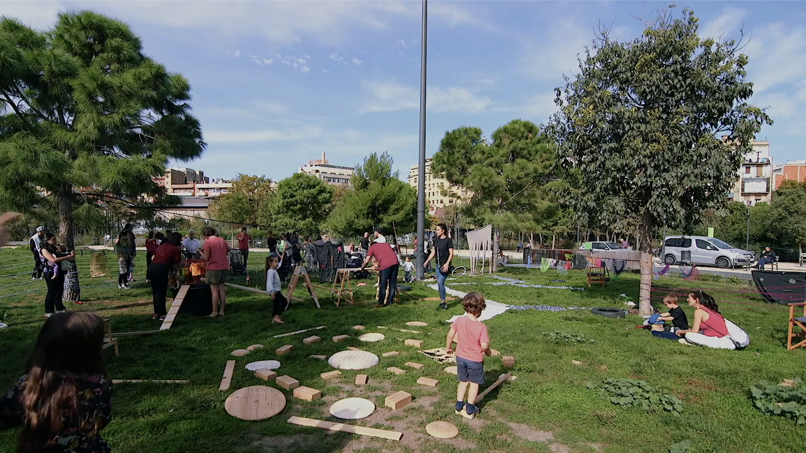 Three of the project co-creation workshops took place in green open spaces. Two of them were held in La Clariana, an ample green open space within the recently transformed area of Les Glòries that integrates several nature based solutions. This space offered children and their families a relaxed environment where they could enjoy the co-creation workshops, away from cars and other urban noises. The last workshop took place in a naturalised schoolyard, where children and their families enjoyed the play opportunities offered by the natural play elements of the school Jaume I playground.