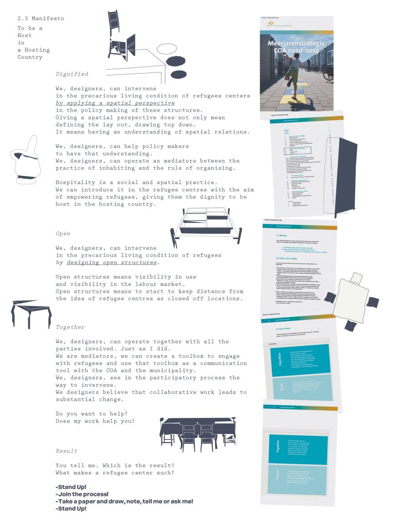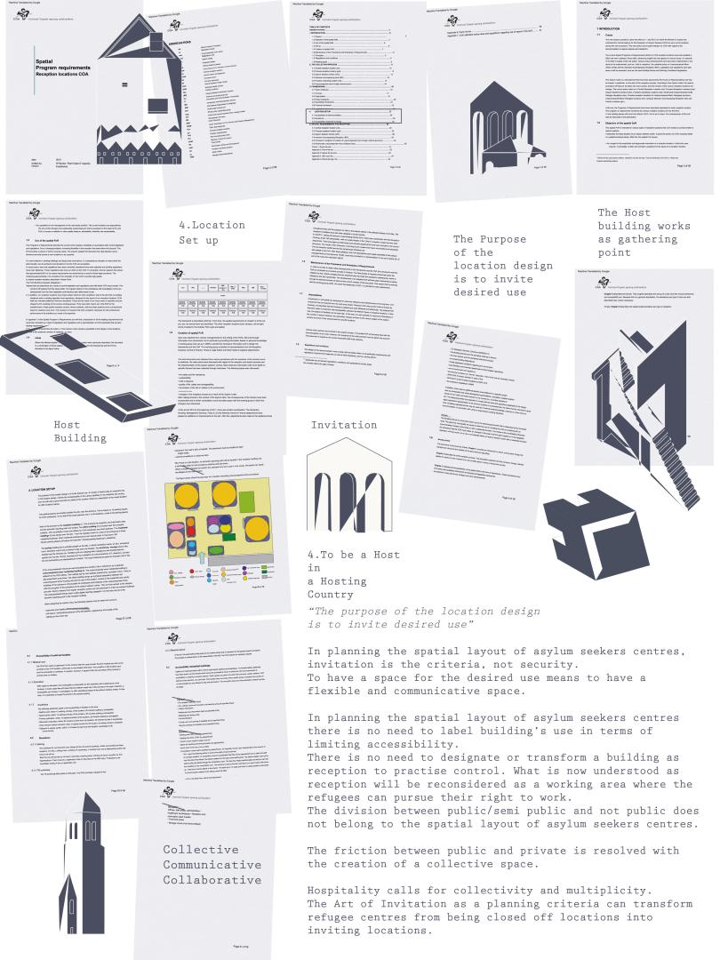 Recognizing that the current Dutch policy regulations lack an understanding from the asylum seekers' perspective and miss the necessity of creating collective spaces, this project develops a proposal for municipalities. In particular it introduces The Art of Invitation as a new fundamental criteria for the planning of these centres. The proposal comes to life not only with a new wording but also with illustrations to show how the architectural drawing is no longer exclusively about spatial configurations, but includes traces and objects of everyday use patterns. The hope is that The Art of Invitation will constitute a base for the allocation of refugee centres with the presence of a collective space. The ambition of the project is to make that space the place where asylum seekers can also work, since,depending on their asylum status, they are not entitled to do so.