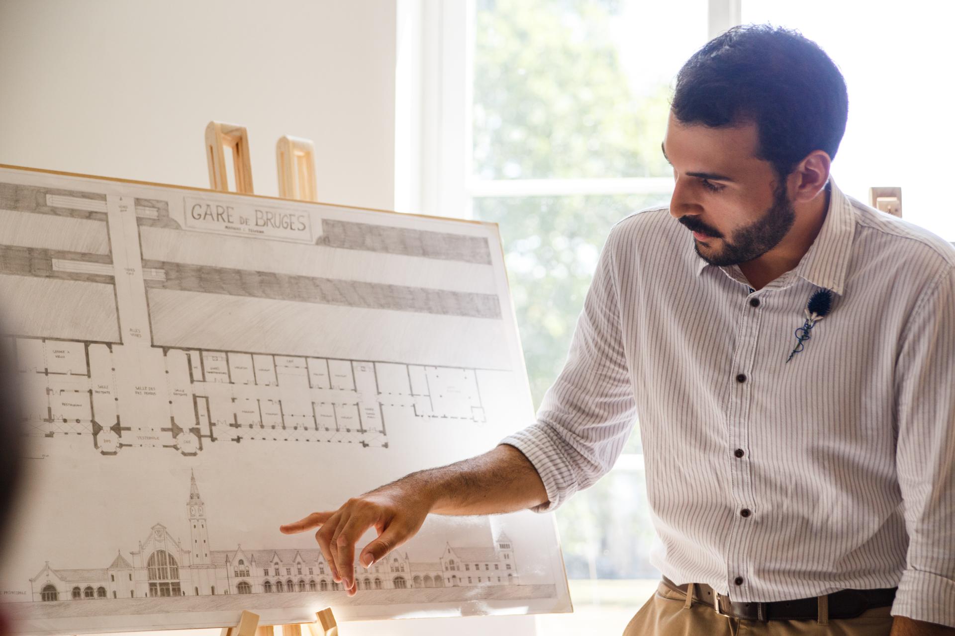 Teachers are architects, historians, craftsmen, economists, urbanists and philosophers and together they train the students (aged 16 to 40) from all over the world for 1 to 2 months in the beautiful city of Bruges. The students discover the history of architecture, the rigor of geometry and hand drawing, the fondamental principles behind healthy, durable and beautiful places, the use of natural materials and proven construction techniques ; they exercise their eyes and their judgement on proven architectural forms; they are free, finally, to dip their pencil in any era to conceive an architecture worthy of our own.