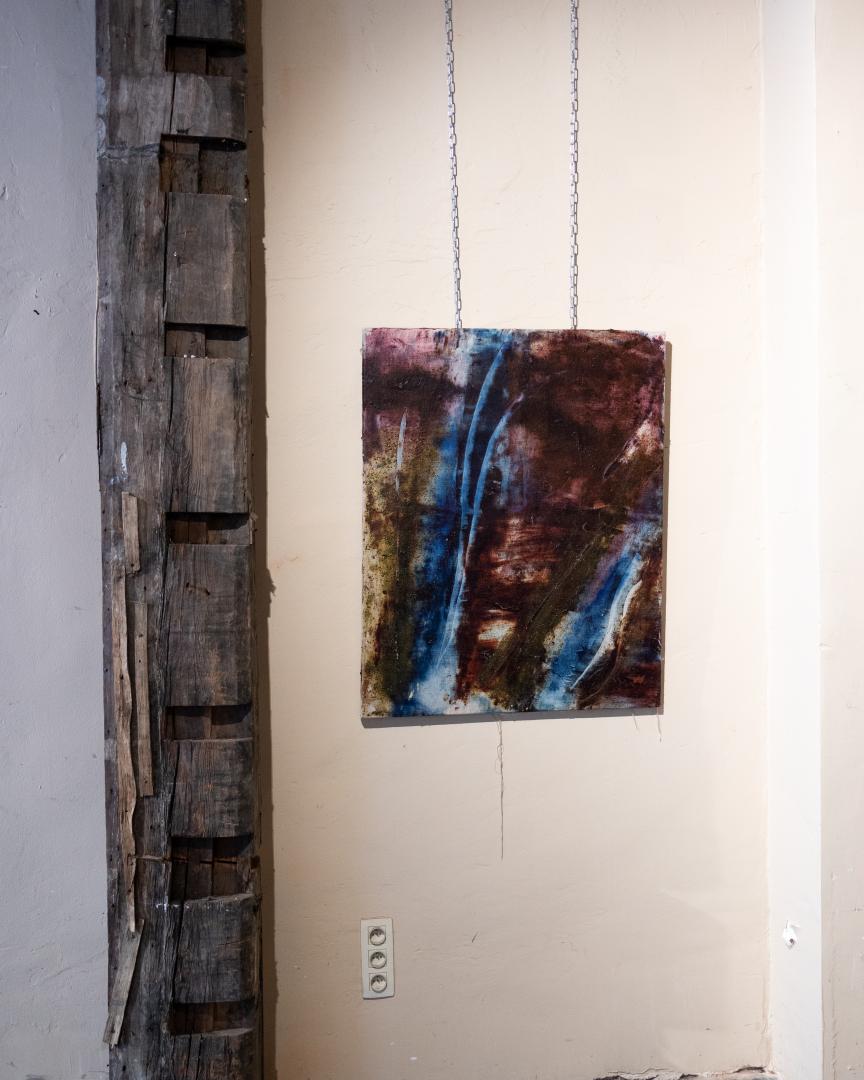 The first step was to get the idea which quickly came to me, I had the idea before starting the master and really wanted to work on this. After that, the question was how I can create a sus- tainable painting, so the research to find a suitable material began. Once I found the material, I started working out different techniques that I could use a making a selection of the ones that would work, to prevent excessive experimen- tation. I started experimenting and doing tests with the pigments until I was satisfied with the looks and feel and if the pigments reacted well by using these techniques.