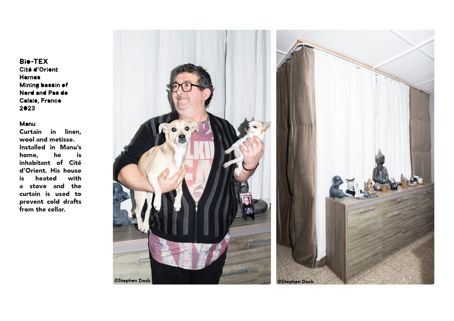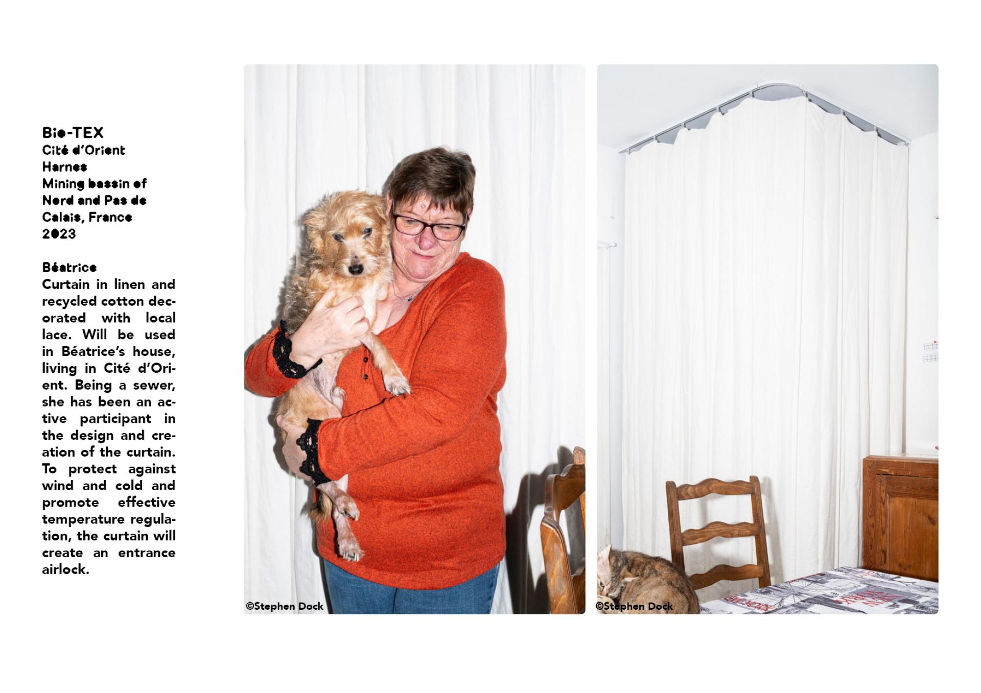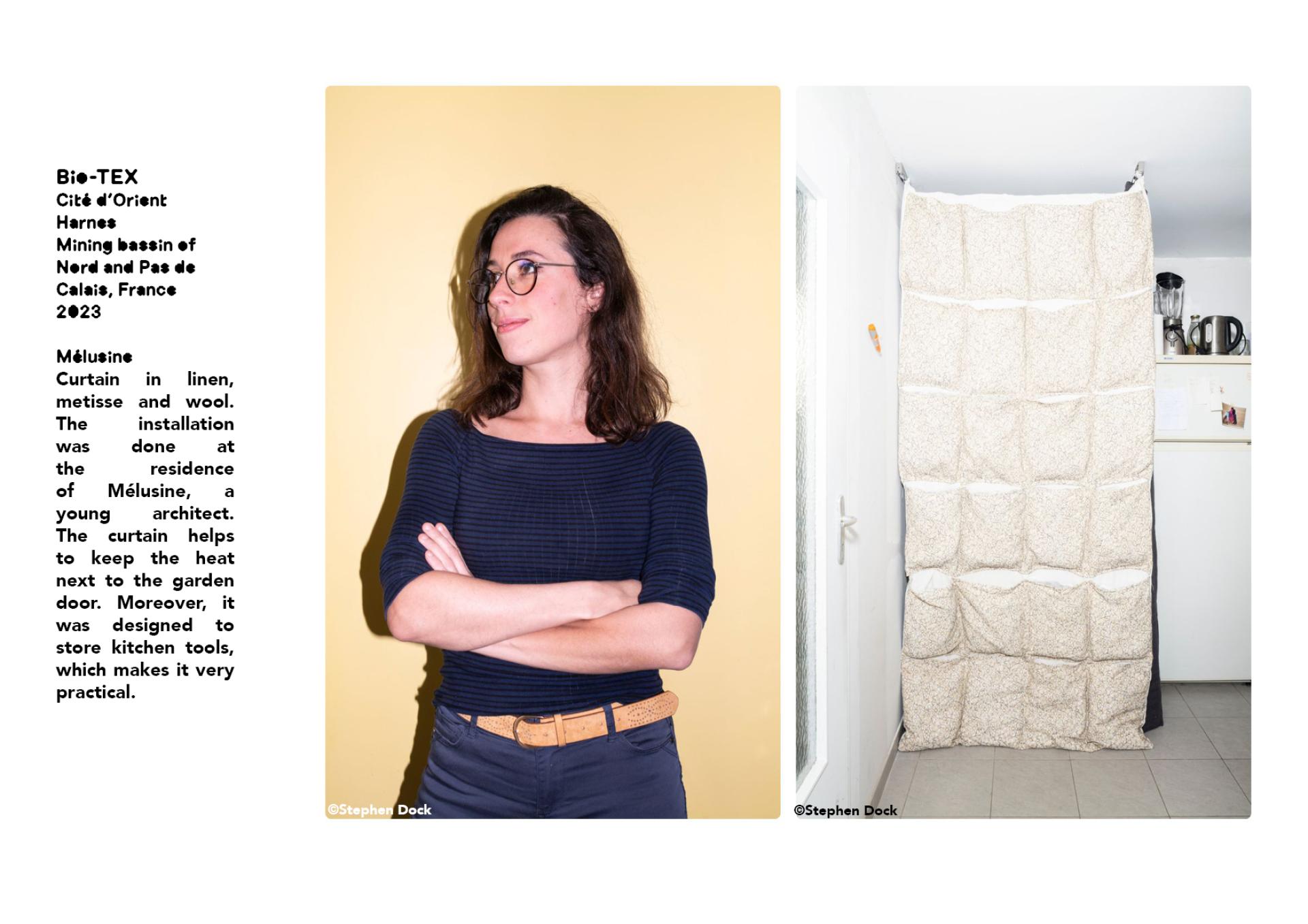 To renovate mining houses, the Bio-TEX project involves making hygrothermal curtains. 4 large curtains, combining thermal function (cutting off cold radiation, stopping cold air current, sun/heat protection), hygroscopic (storing water vapor, CO2 and Volatile Organic Compounds (VOCs)), and aesthetics (fluid and warm to the touch) to improve Harne's inhabitant's comfort and air quality have been created.