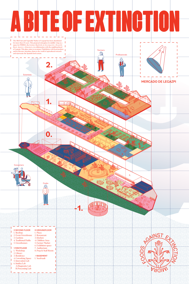 According to the FAO, more than 80% of seeds ever cultivated have been lost forever. This project addressds the decline of food diversity and culinary memory in the Madrid region, focusing on preserving agricultural biodiversity, reconnecting people with forgotten flavors and agriculture, and stimulating culinary evolution by rehabilitating the Old Fruit and Vegetable Market of Legazpi as a hub for agricultural research, culinary experiences, and community engagement.
