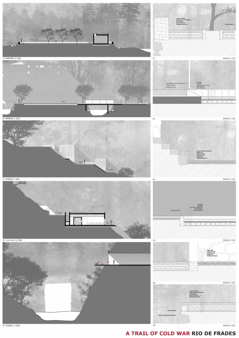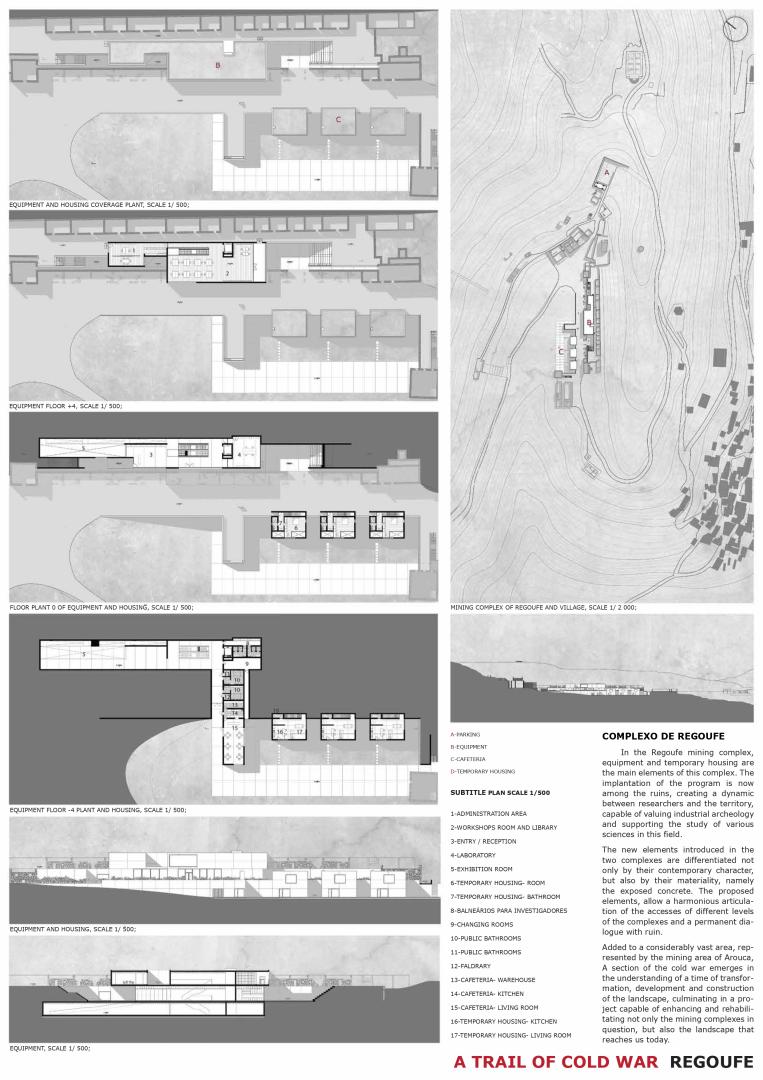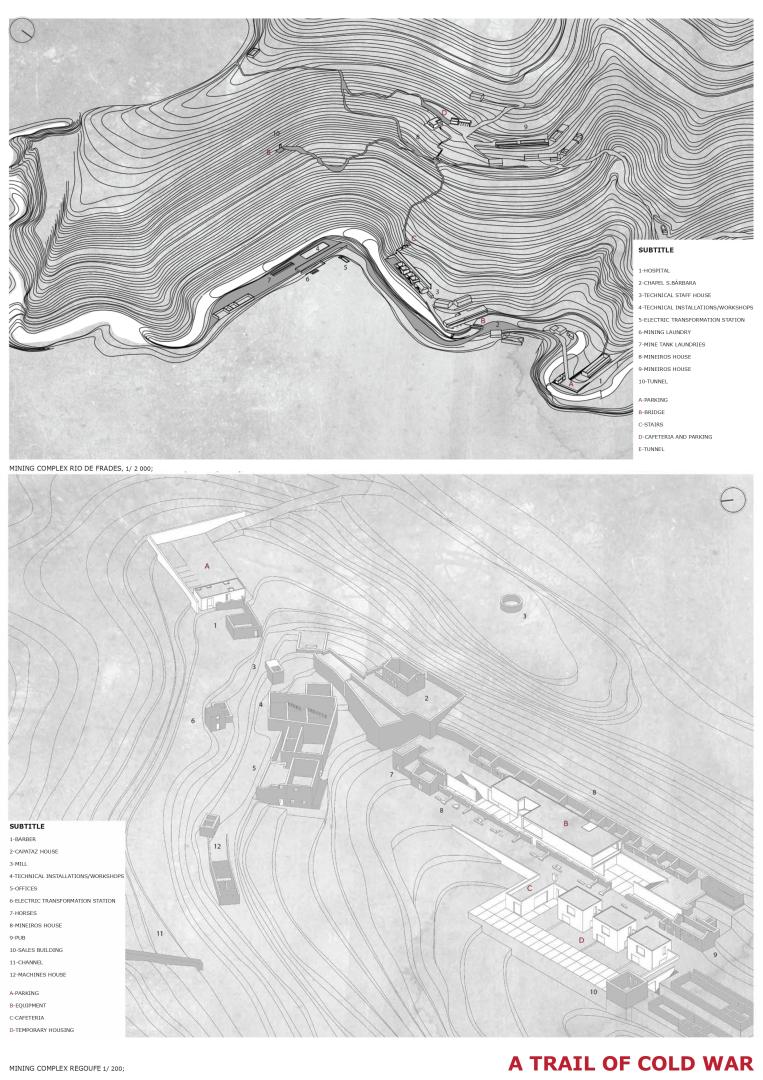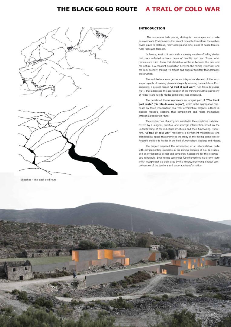 The developed theme represents an integral part of “The black gold route” (“A rota do ouro negro”), which is the aggregation composed by three independent final year architecture projects outlined in distinct Arouca’s locations that complement and relate themselves through a pedestrian route. The construction of a program inserted in the complexes is characterized by a surgical, punctual and strategic intervention based on the understanding of the industrial structures and their functioning. Therefore, “A trail of cold war” represents a permanent museological and archeological space that promotes the study of the mining complexes of Regoufe and Rio de Frades in the field of Archeology, Geology and History. The project proposed the introduction of an interpretative route with complementing elements in the mining complex of Rio de Frades, and an investigative center and temporary habitations for the investigators in Regoufe. Both mining complexes fuse themselves in a drawn route which incorporates old trails used by the miners, promoting a better comprehension of the territory and landscape transformation.
