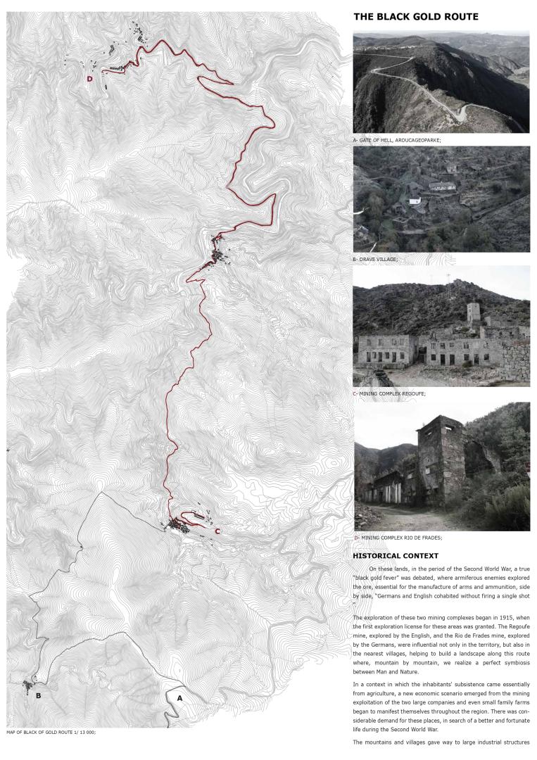 The Black Gold Route, a section of the cold war constituted a project that allows to demonstrate that the interventions complement each other, not only by valuing the industrial and rural heritage, but also by strategy and reading at the scale of the territory carried out together. aggregate to a considerably vast area, represented by the mining area of Arouca, A section of the cold war arises in the understanding of a time of transformation, development and construction of the landscape, resulting of a project capable of valuing and rehabilitating not only the mining complexes in question, but also the landscape that reaches us today.