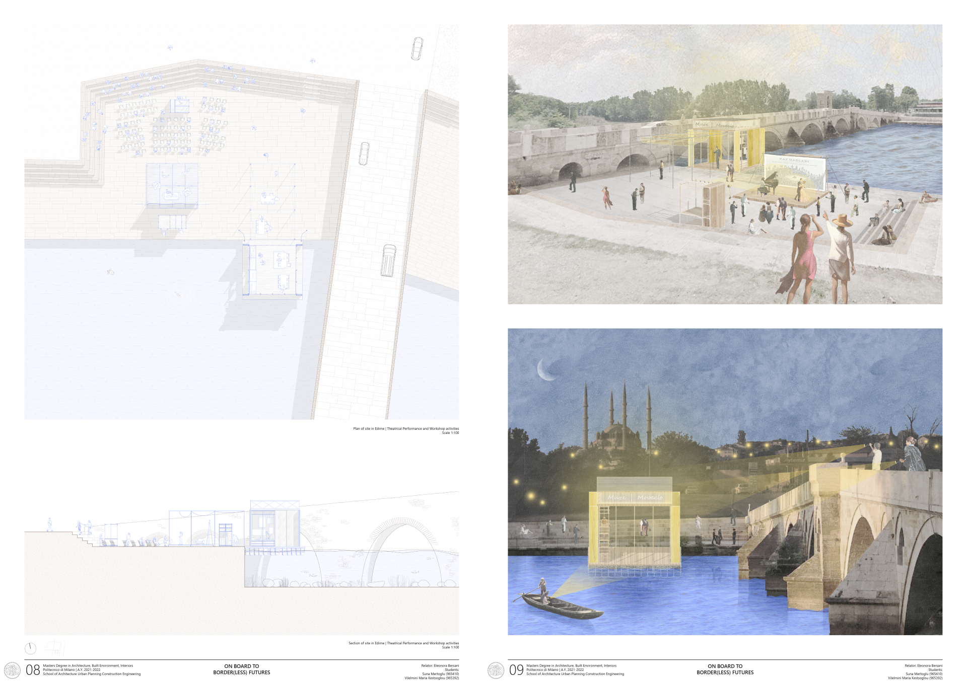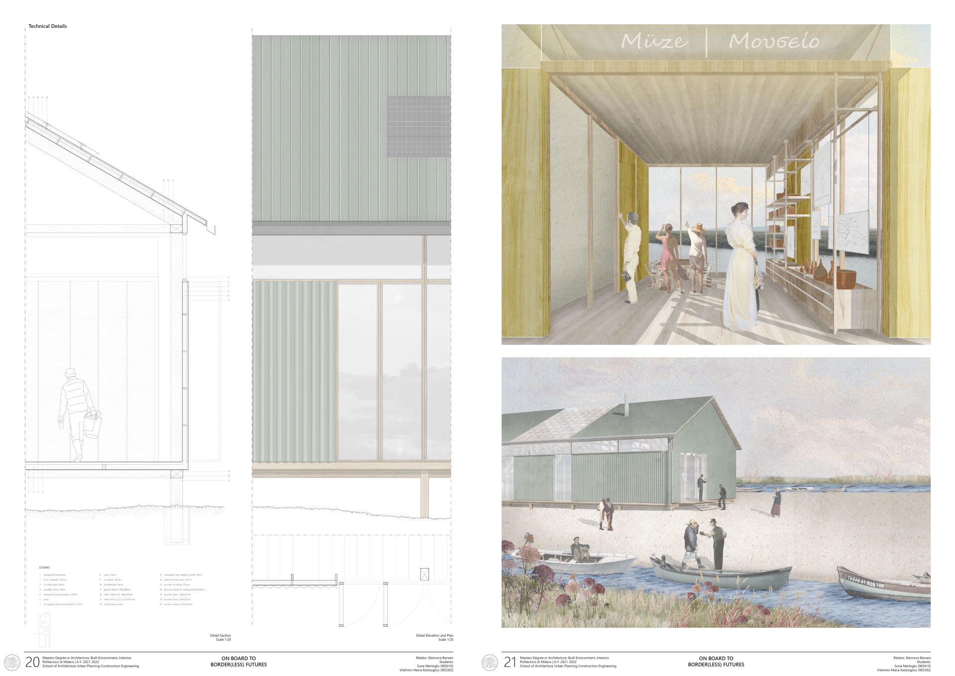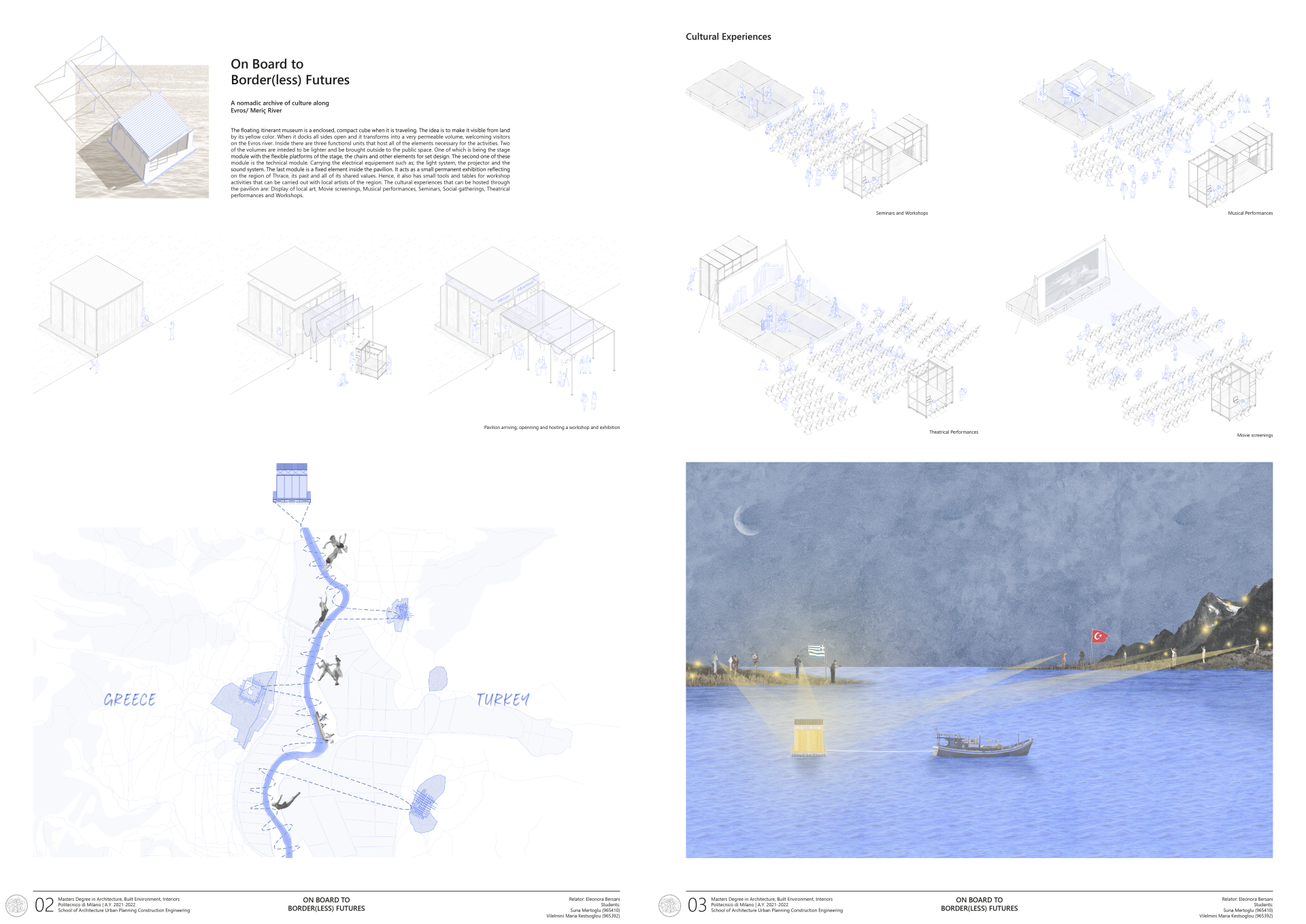 Our proposal is an itinerant museum in the water giving access to culture and improving the quality of life of people living on the border between Greece and Turkey. The pavilion while traveling has a compact shape but reaching its destination opens into an urban room, spreading its elements in the public space. Its interior space hosts a permanent exhibition showcasing the shared heritage of the region and is used for workshops with local artists and craftsmen. Two mobile modules are used to set up a flexible, informal stage in the public space which can be used for different cultural activities.