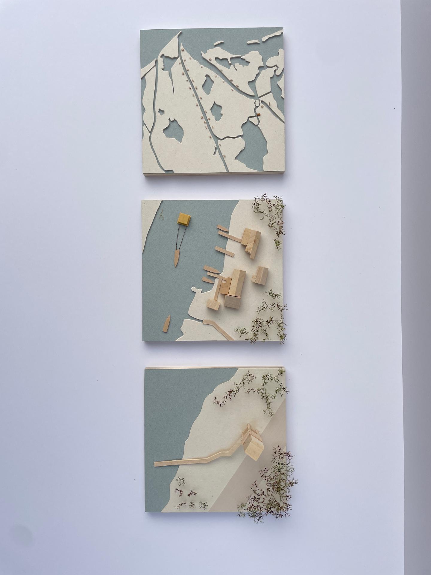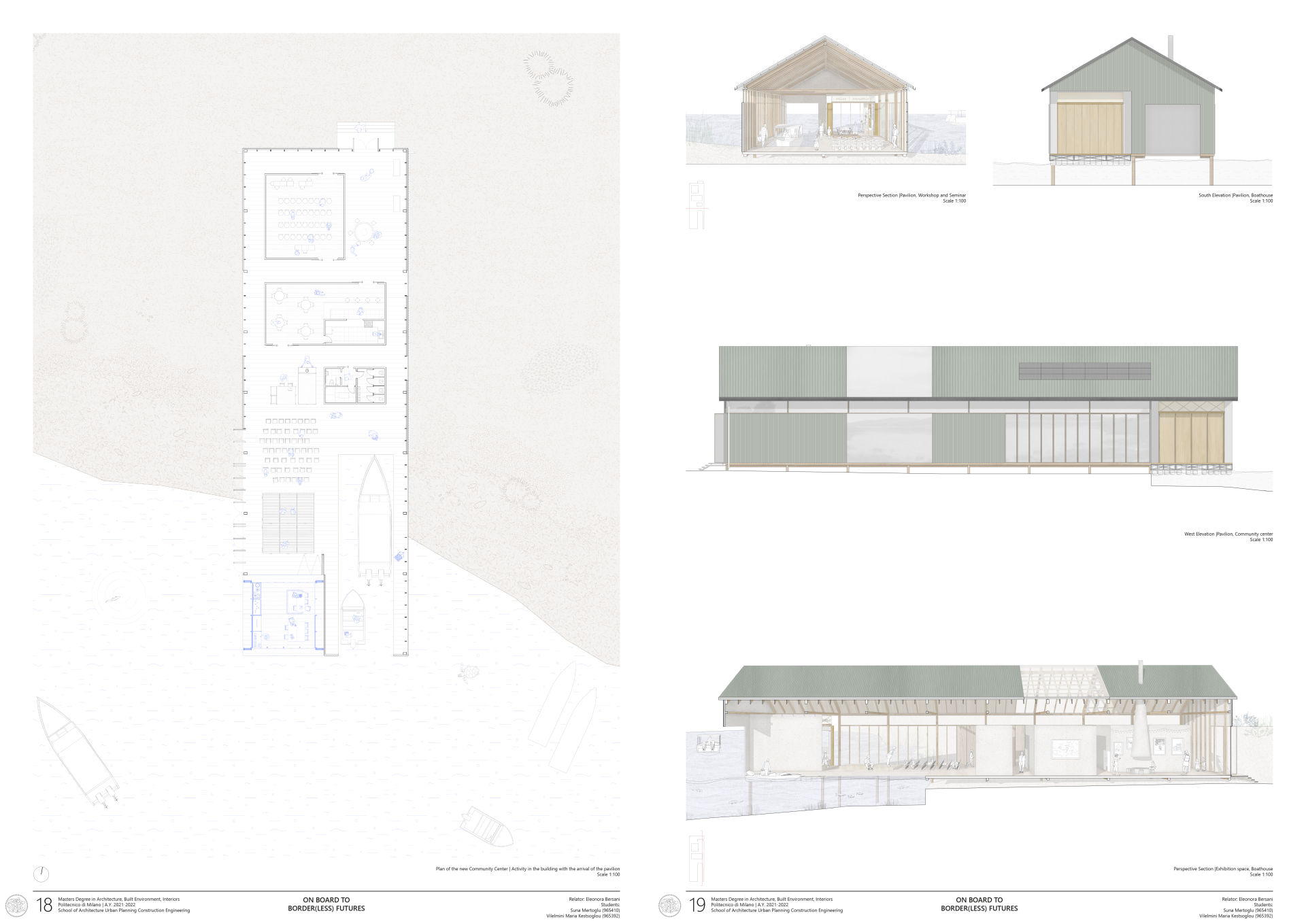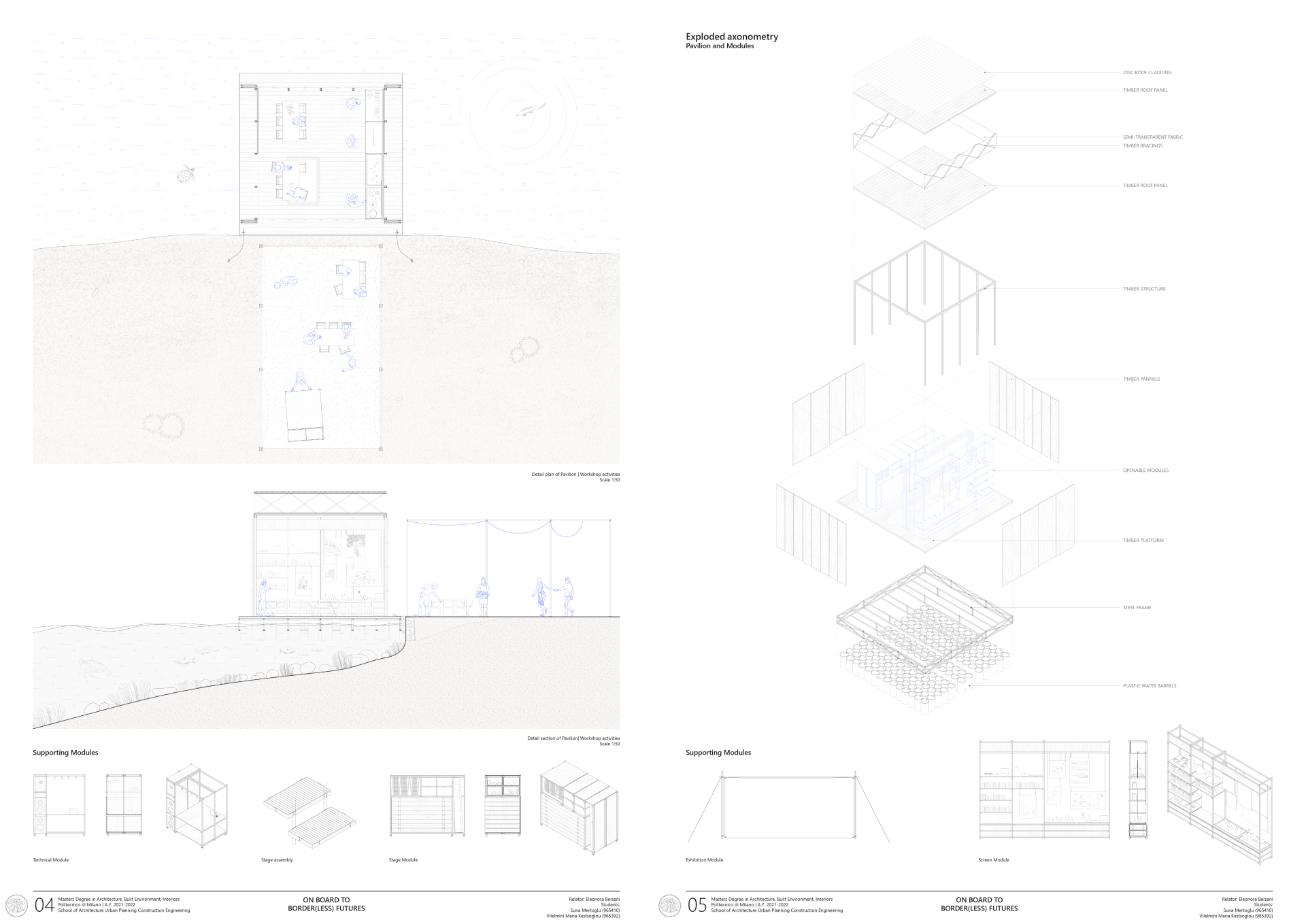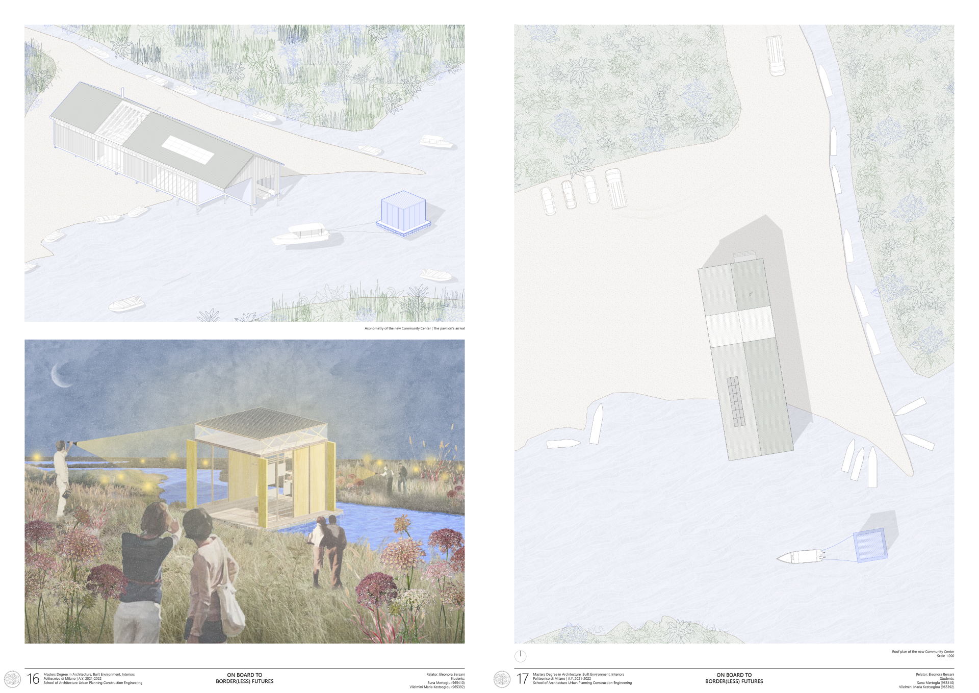 Our proposal is an itinerant museum in the water giving access to culture and improving the quality of life of people living on the border between Greece and Turkey. The pavilion while traveling has a compact shape but reaching its destination opens into an urban room, spreading its elements in the public space. Its interior space hosts a permanent exhibition showcasing the shared heritage of the region and is used for workshops with local artists and craftsmen. Two mobile modules are used to set up a flexible, informal stage in the public space which can be used for different cultural activities.