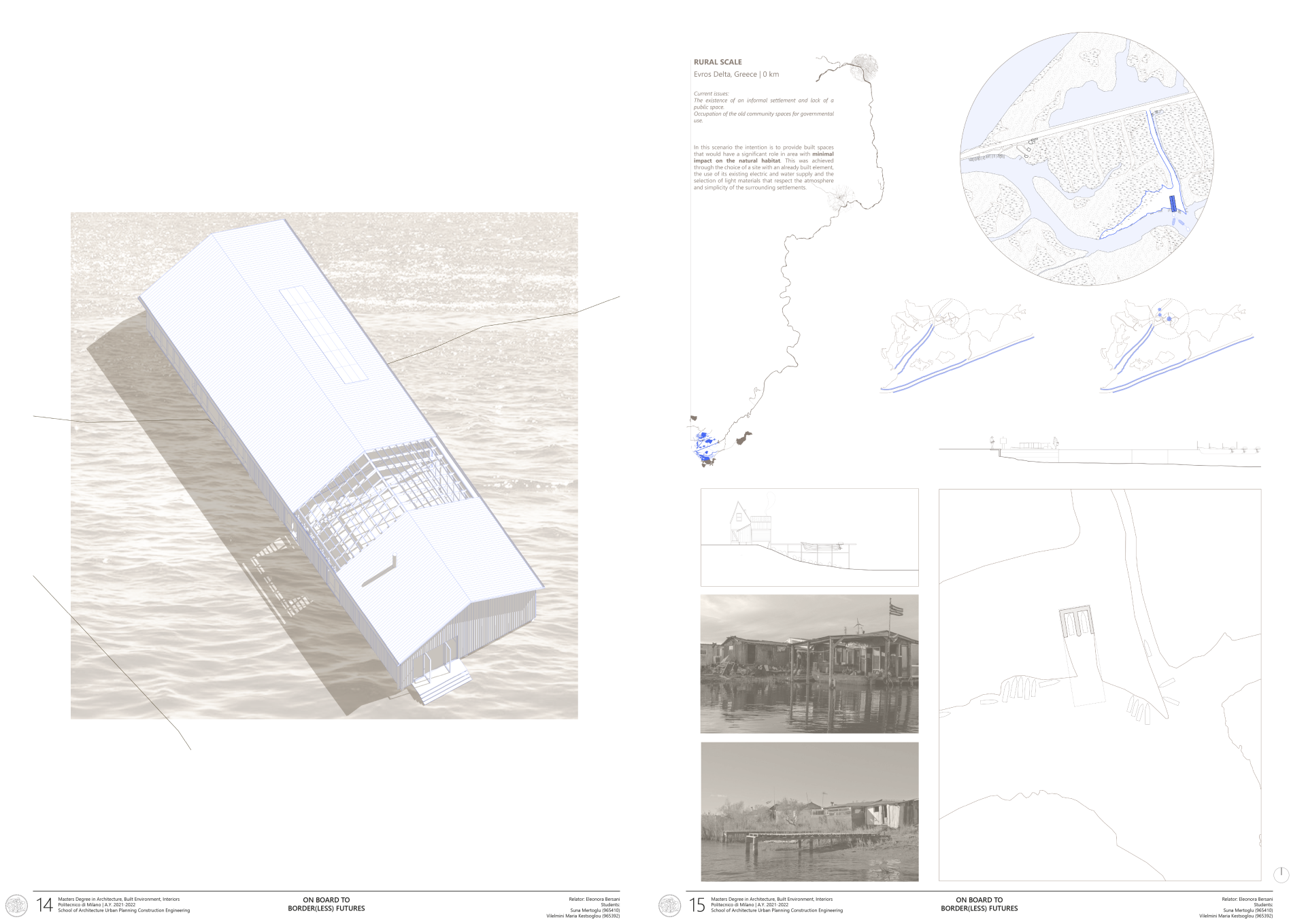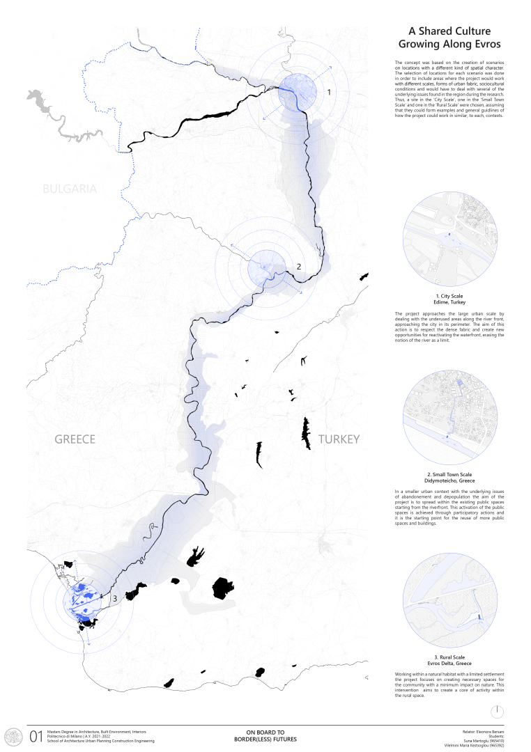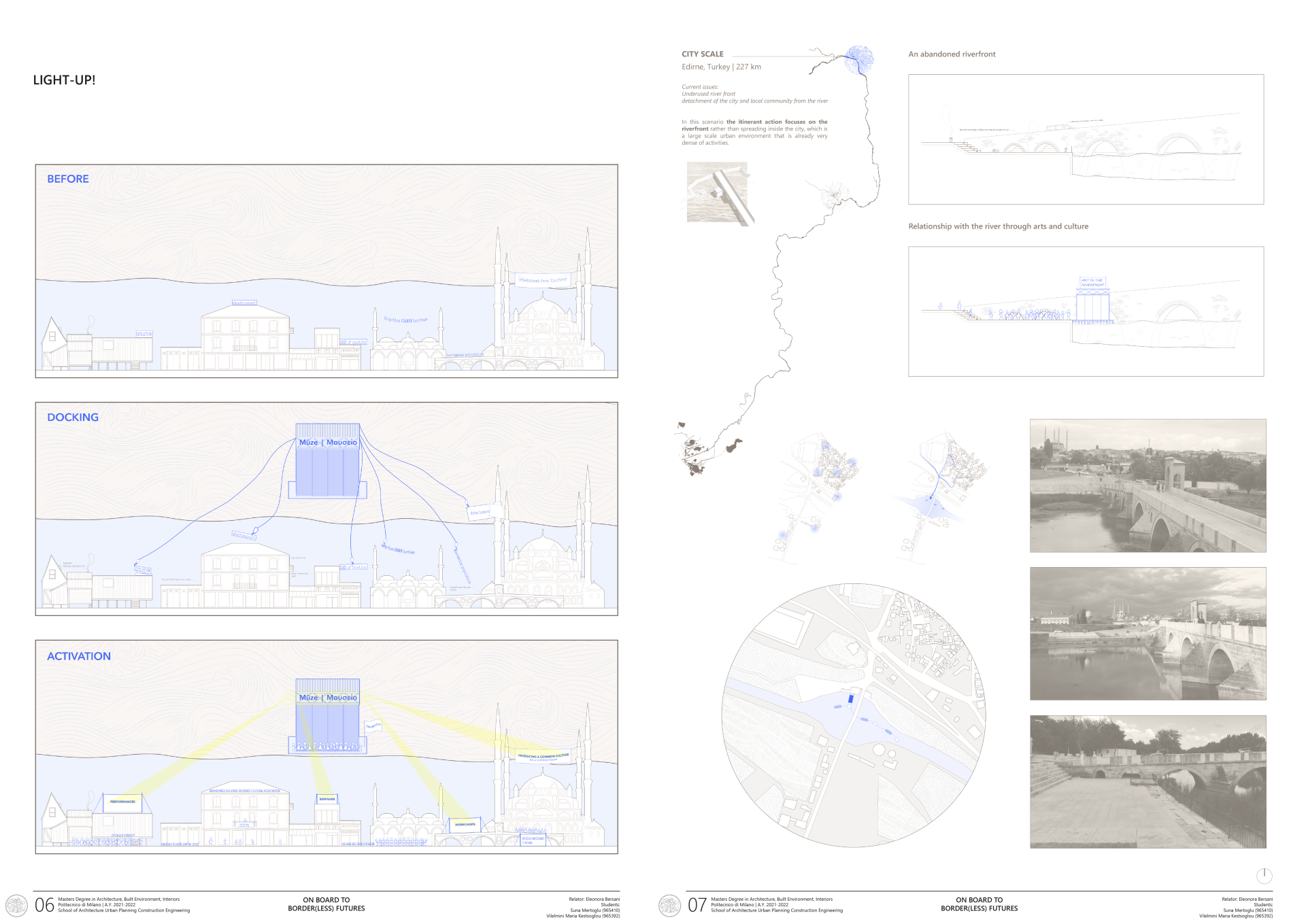 This research focuses on the complex realities that define the Evros/Meric river and its overall region of Thrace. A region that now is trisected but throughout its history was home to diverse populations of different ethnicities, religions and cultures, cohabiting it freely. After the Treaty of Lausanne, people of this region faced its division into nations-states, which was followed by a forced population exchange and the construction, by each country, of its national narrative and ideology. This was at times used in order to surface ethnic and cultural differences between the people of Thrace, slowly erasing the memory of their shared past as citizens of Empires. Today, Evros river has become the symbol of this forced division, transforming into an “arcifinious” border, fortifying the limits of the European Union. Recent political events, such as the refugee crisis, have drawn attention to the region, its militarization and the weaponization of Evros river, which have led to its portrayal as a critical zone. Consequently, this has had an impact on the relationship of the local populations with the river, discouraging them to approach and use it in their everyday lives.
