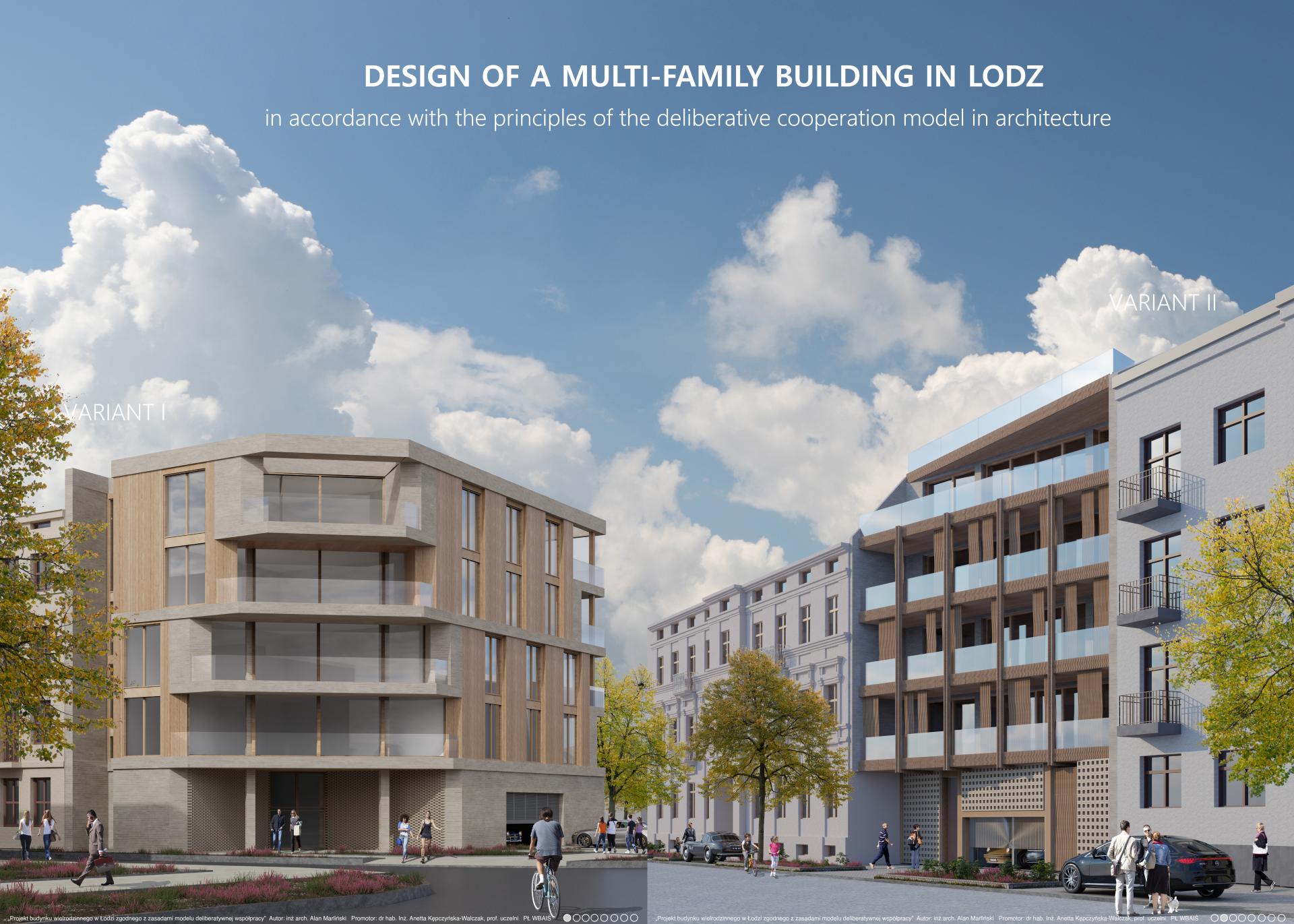 On the basis of the conclusions from the first part, a design of two variants of multi-family residential buildings in the urban fabric was created, which presents the possibilities that could be achieved by the Deliberative Cooperation or Housing Cooperative. The aim was to simulate what such a building could look like, where it could be located and how it would function, and what it could achieve in terms of architecture and urban planning in the city of Lodz.