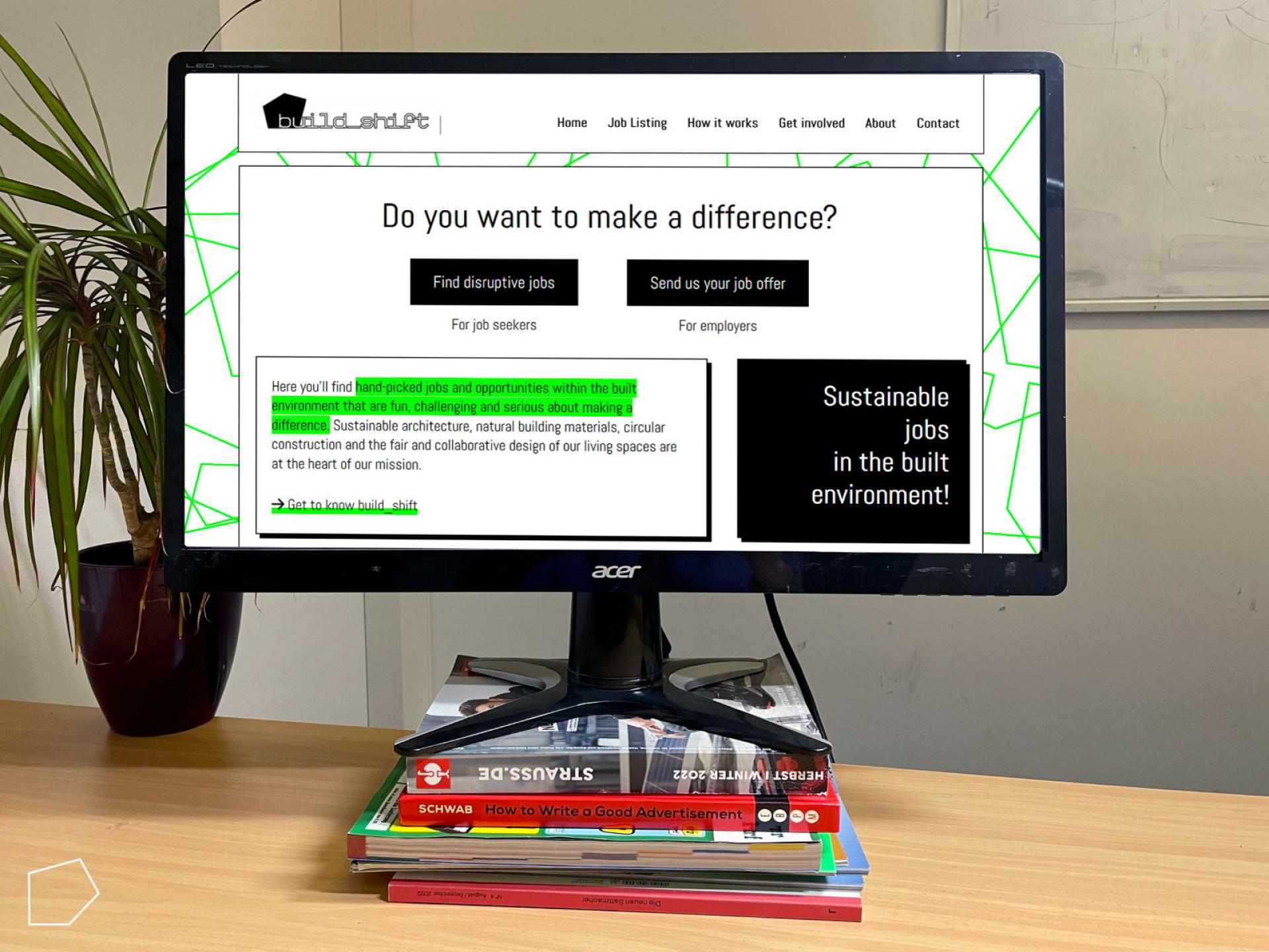 "build_shift" is an independent platform that publicizes jobs in the built environment sector that are serious about sustainability and fairness. Since its launch in July 2022, we have published around 500 impactful jobs from more than 20 European countries. The platform's ultimate goal is to bring together committed individuals and organizations as we believe that we can only achieve a climate-friendly and socially just transformation in the building industry if we team up and work together.