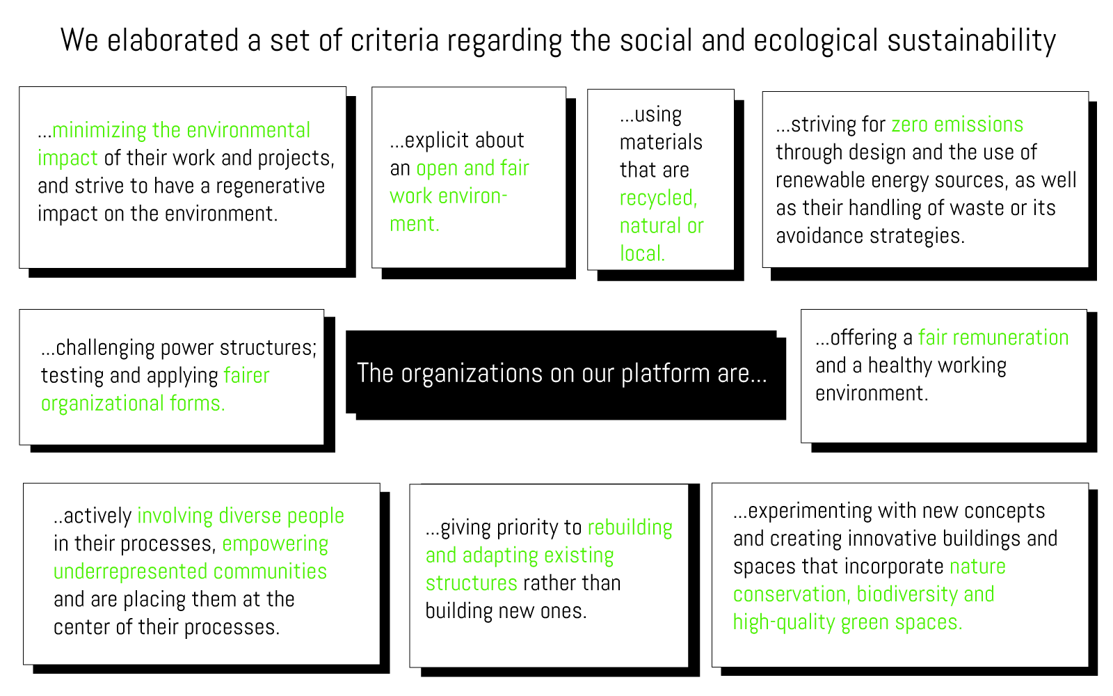 Our main approach is to make visible what is currently happening to make the built environment more sustainable and fair by collecting all these actors and possibilities and bringing them together on one platform. By mapping the job opportunities on our platform, we want to make them more accessible, as they are usually not so easy to find in the overwhelming amount of other job offers. In this way, we want to give visibility to the actors behind it and create a connection between like-minded and committed people. By keeping it voluntary, we want to ensure that no actor is excluded for financial reasons.