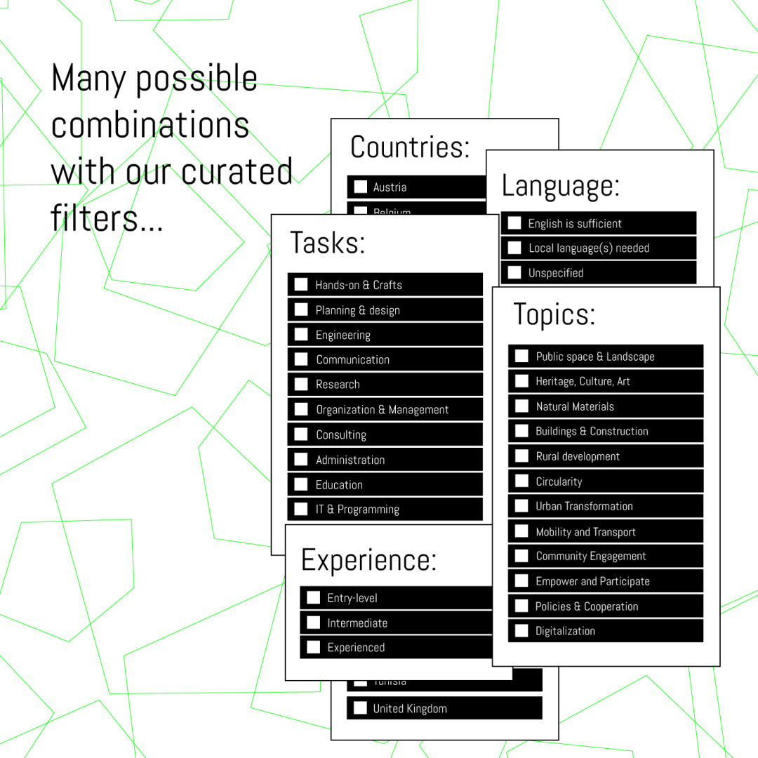But besides extending it to other world regions, it can also be enlarged regarding the opportunities that are mapped or listed on the website, such as funding opportunities, educational formats, calls for projects or papers, prizes, collaborations, community exchange, knowledge exchange, etc. - all related to creating a better living environment for everyone. A further possibility could also be to set further filters on the job search that for example focus on specific groups or beneficiaries or offer special support for job seekers that require help with visas etc.