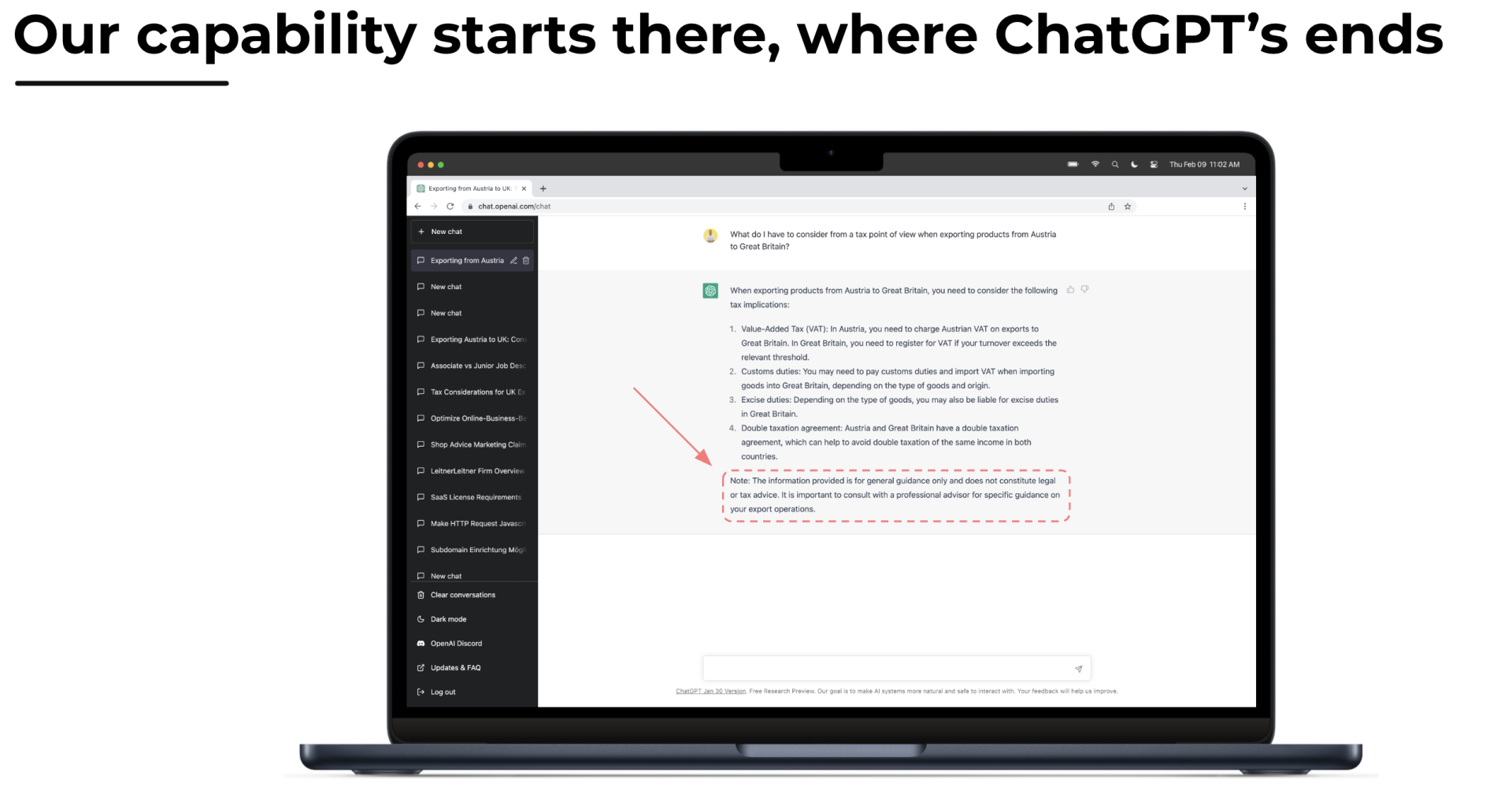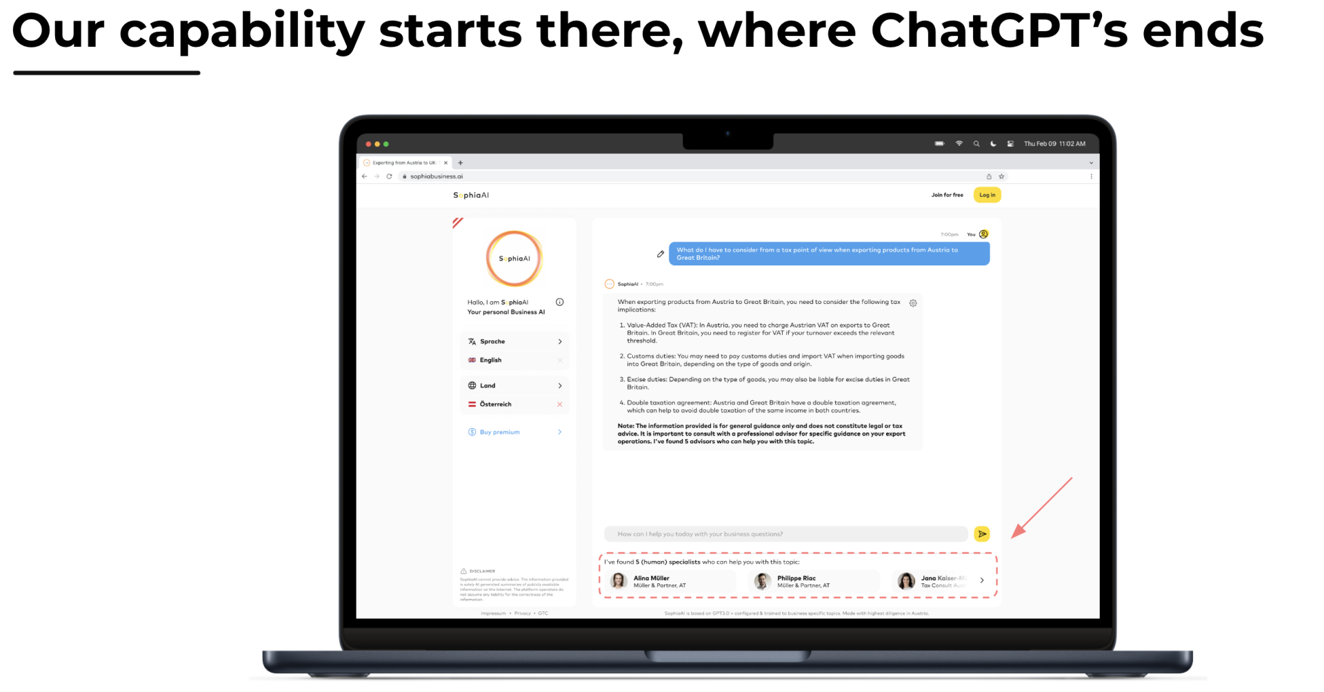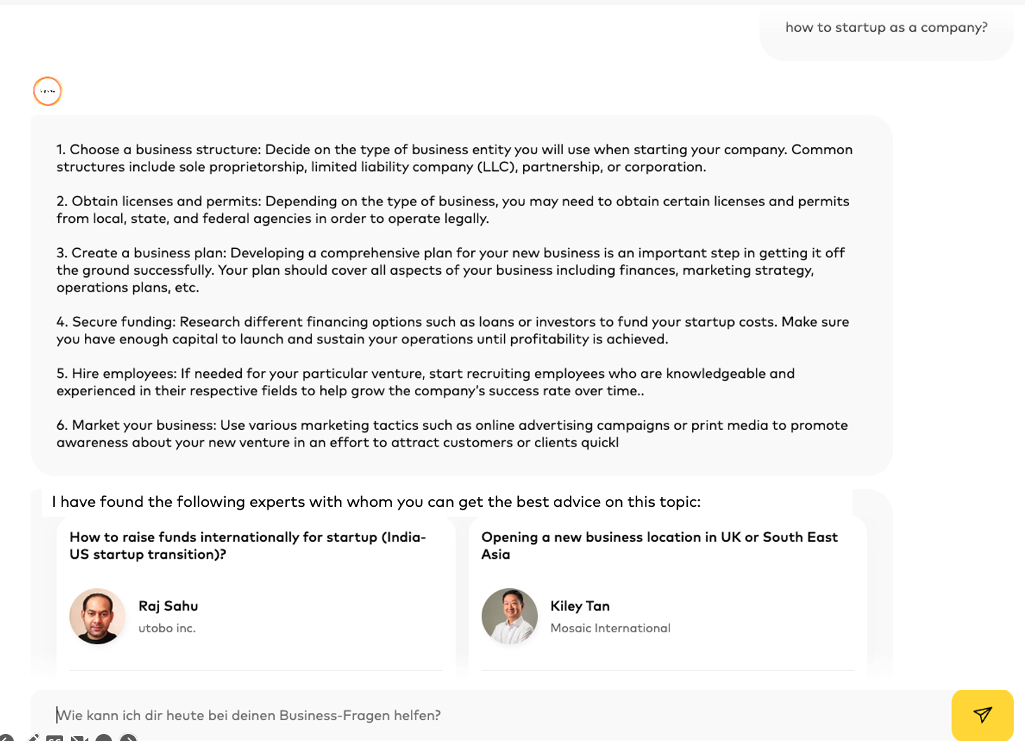 connecting the most inclusive advisory service offer for small businesses with top-notch AI (quality level of Chat-GPT) to bridge the knowledge gap in daily management from starting a company until scaling and internationalisation is - as of today - entirely unique in the world