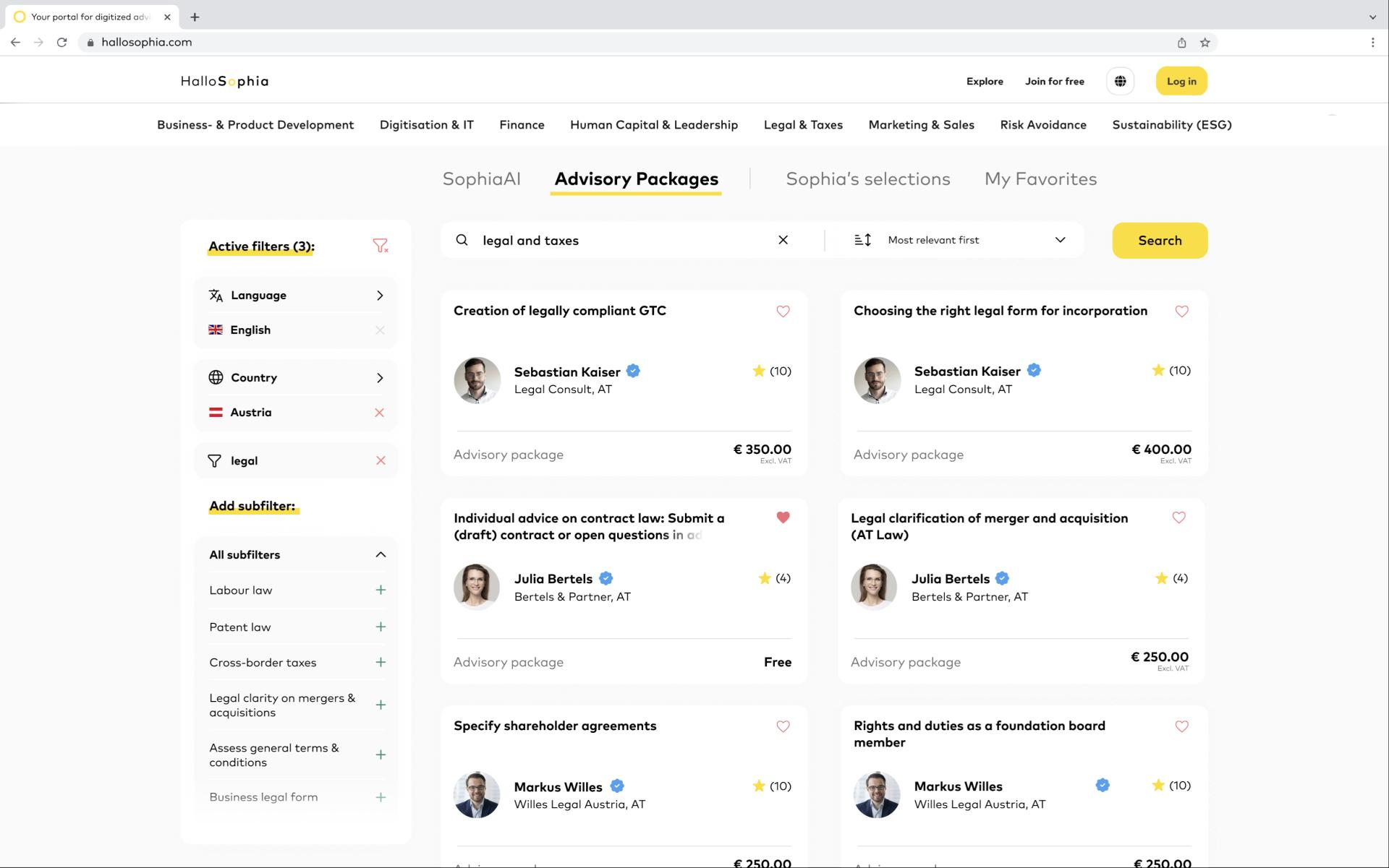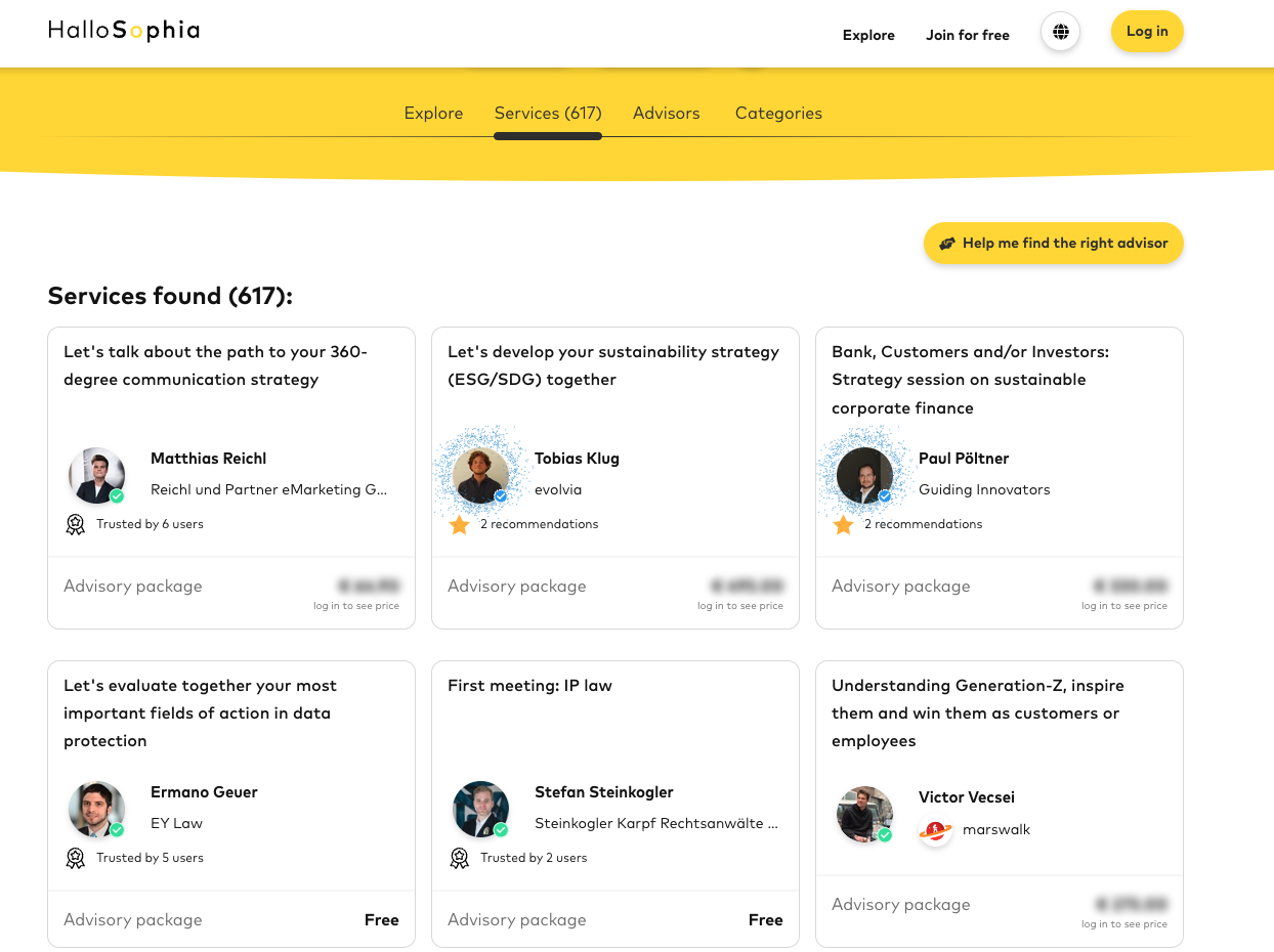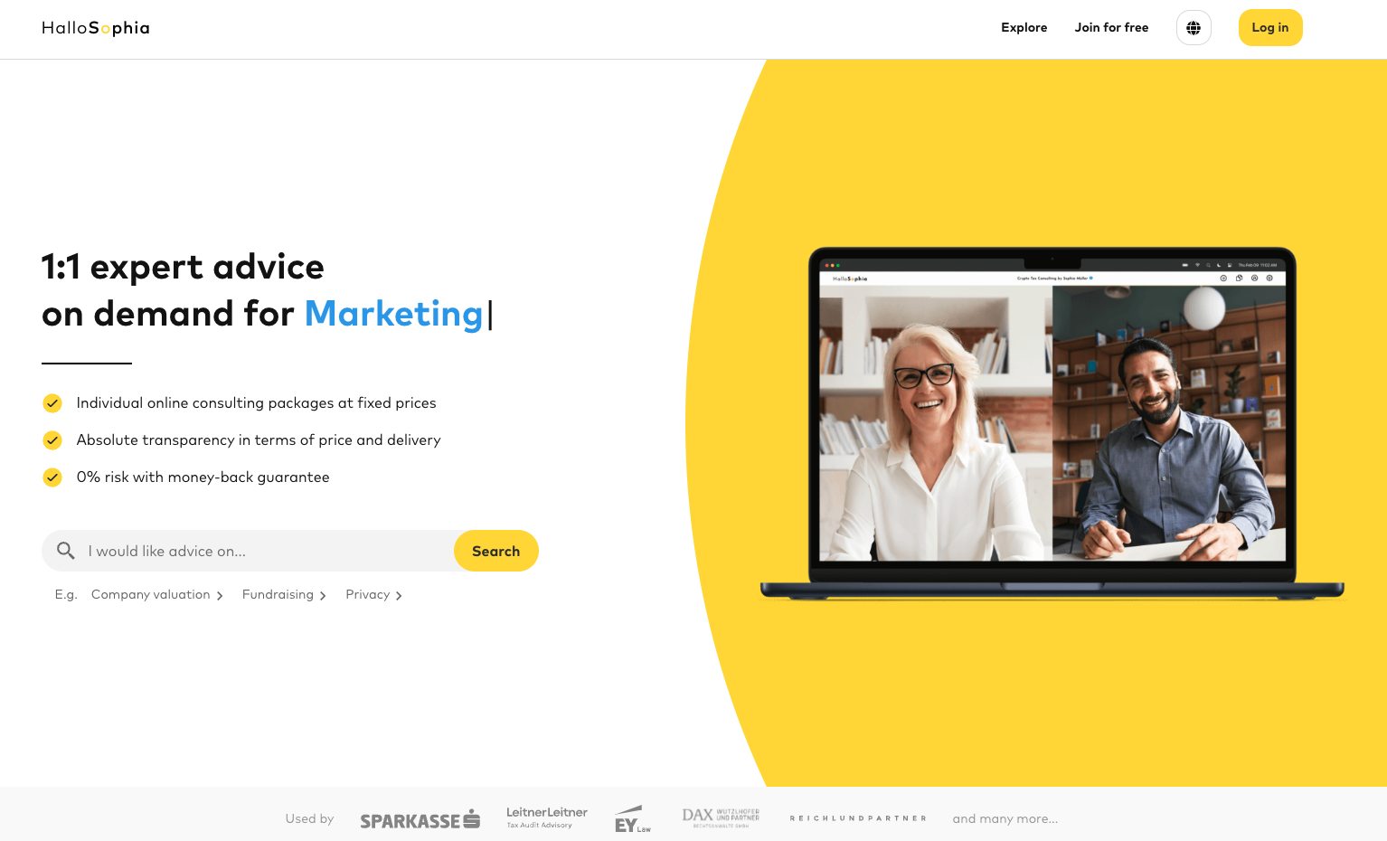 HalloSophia was created together with dozens of business advisors, lawyers, tax advisors and banks and hundreds of young entrepreneurs to make it the most affordable and convenient way of getting expert advice.