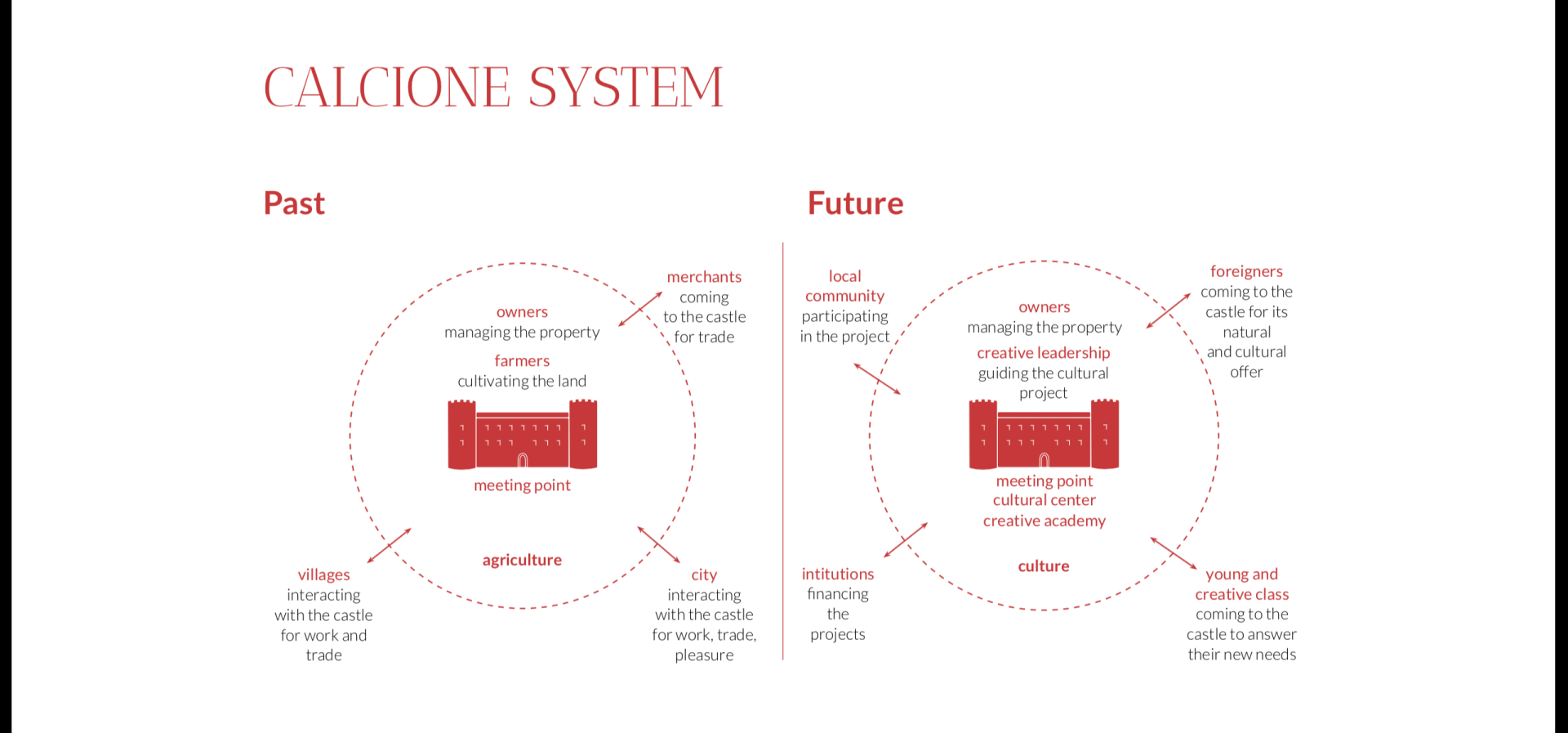 The project as a whole will not end with the achievement of its first strategic objective, which is to guarantee the economic, social and environmental sustainability of the castle system and its territory by enhancing it, but will continue to be a research and experimentation center in step with local and global evolution, returning to be an entity of social, cultural and economic reference, connected to others in the contemporary world.