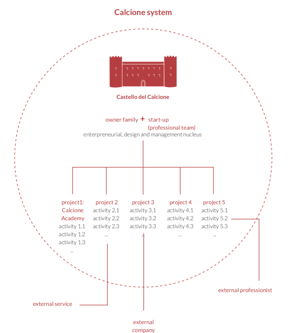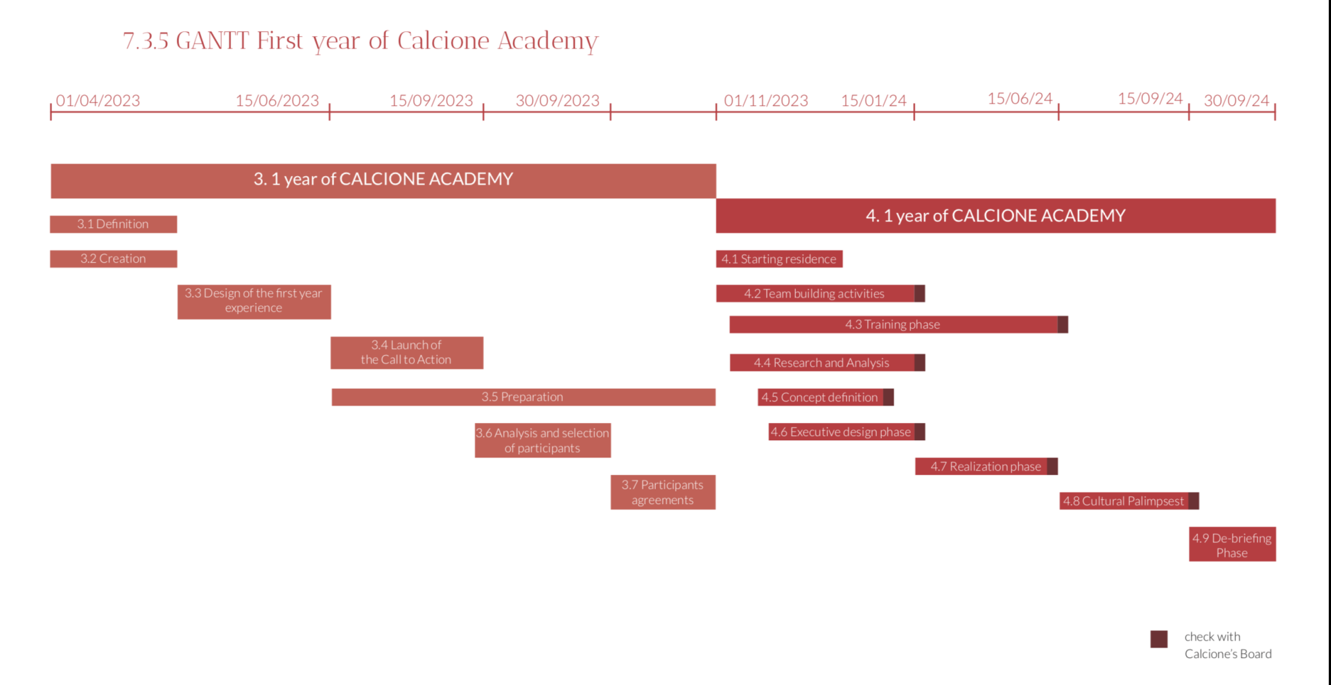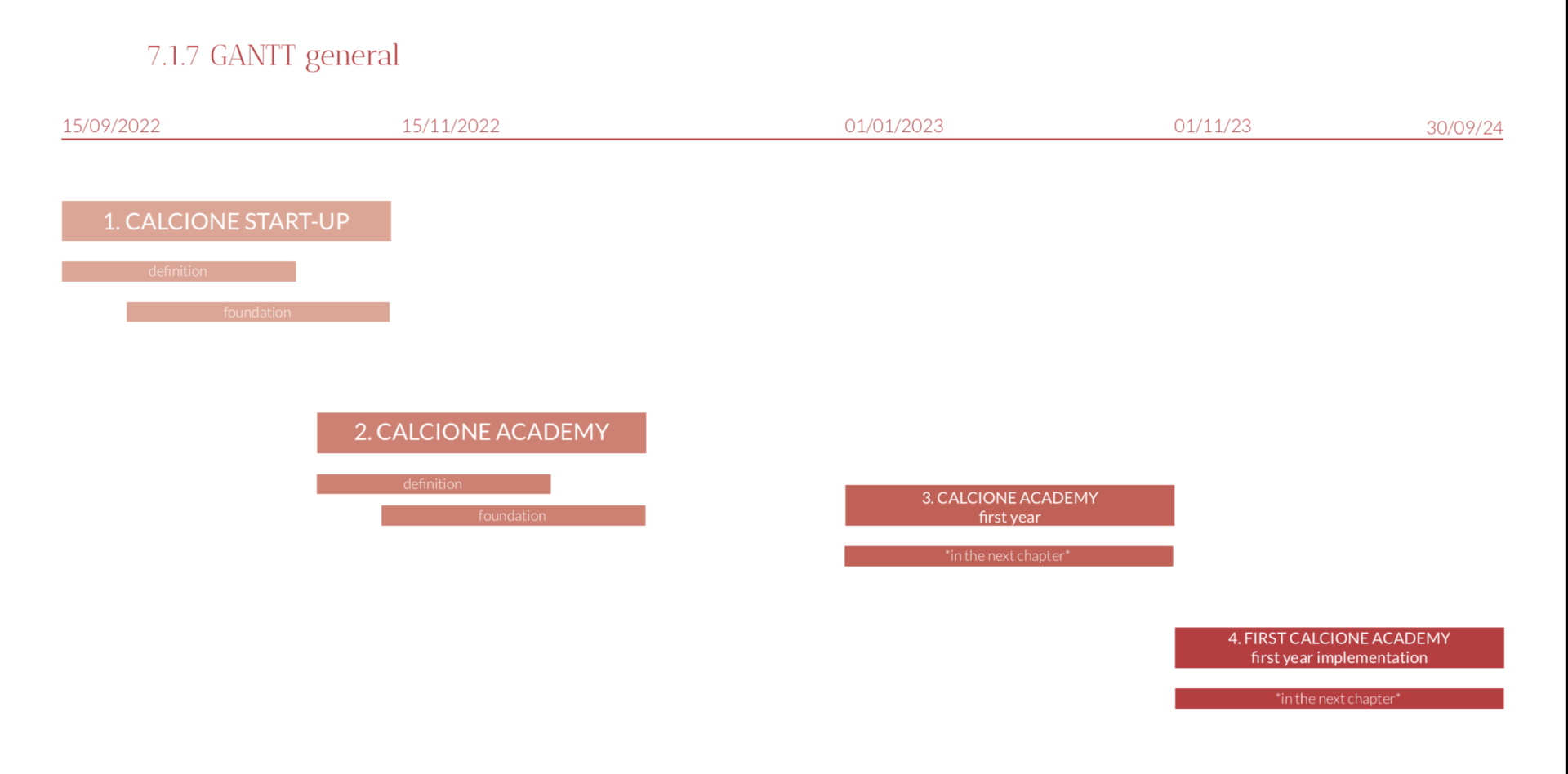 The Start-up and the Board of professionals will be in charge of planning, implementing and monitoring the project of Calcione Academy, based on individual sub-projects. For each sub-project the Board will establish the objectives, the necessary resources, the investments, the costs and the revenues necessary for its management and development.