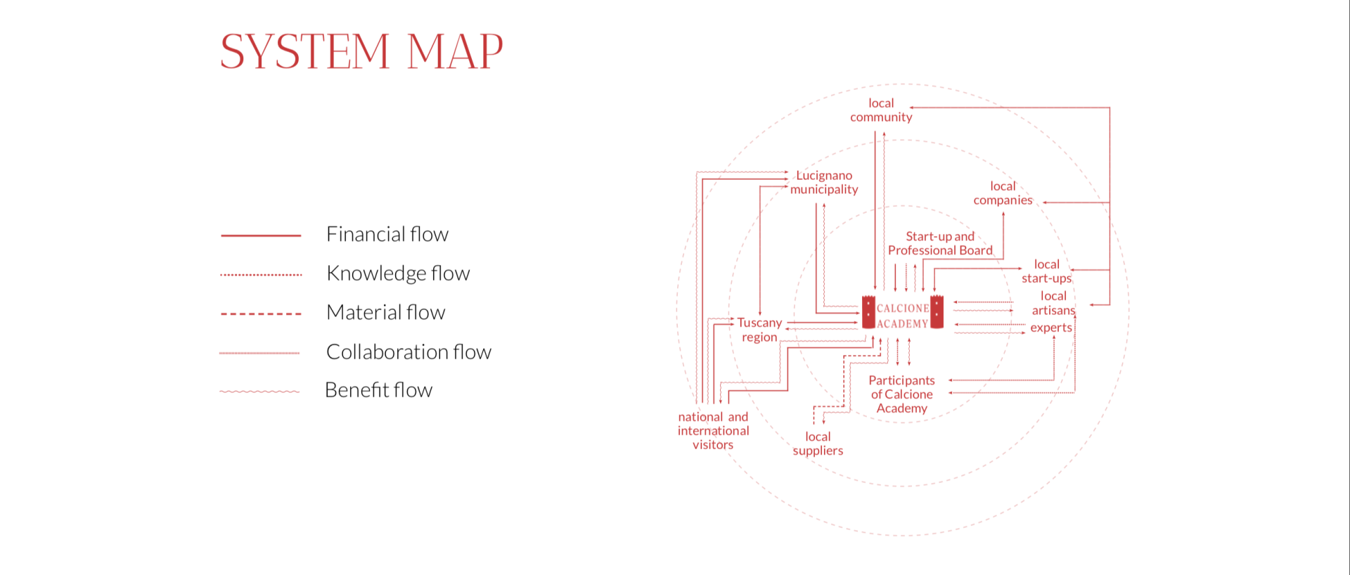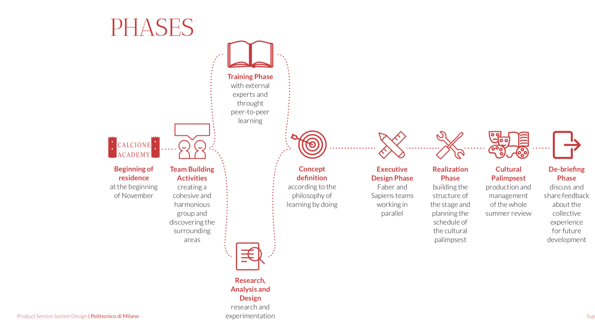 By establishing a virtuous circle, Calcione re-becomes an autonomous and self-sufficient entity, as it was in the past, with a strong local identity and important national and international connections. The goal of Calcione is therefore to coming back to an active role in the contemporary world by creating added value, in cultural and economic terms, for its system, the territory and the stakeholders involved, promoting a new model of collaborative training and implementation process based on learning and doing practice.