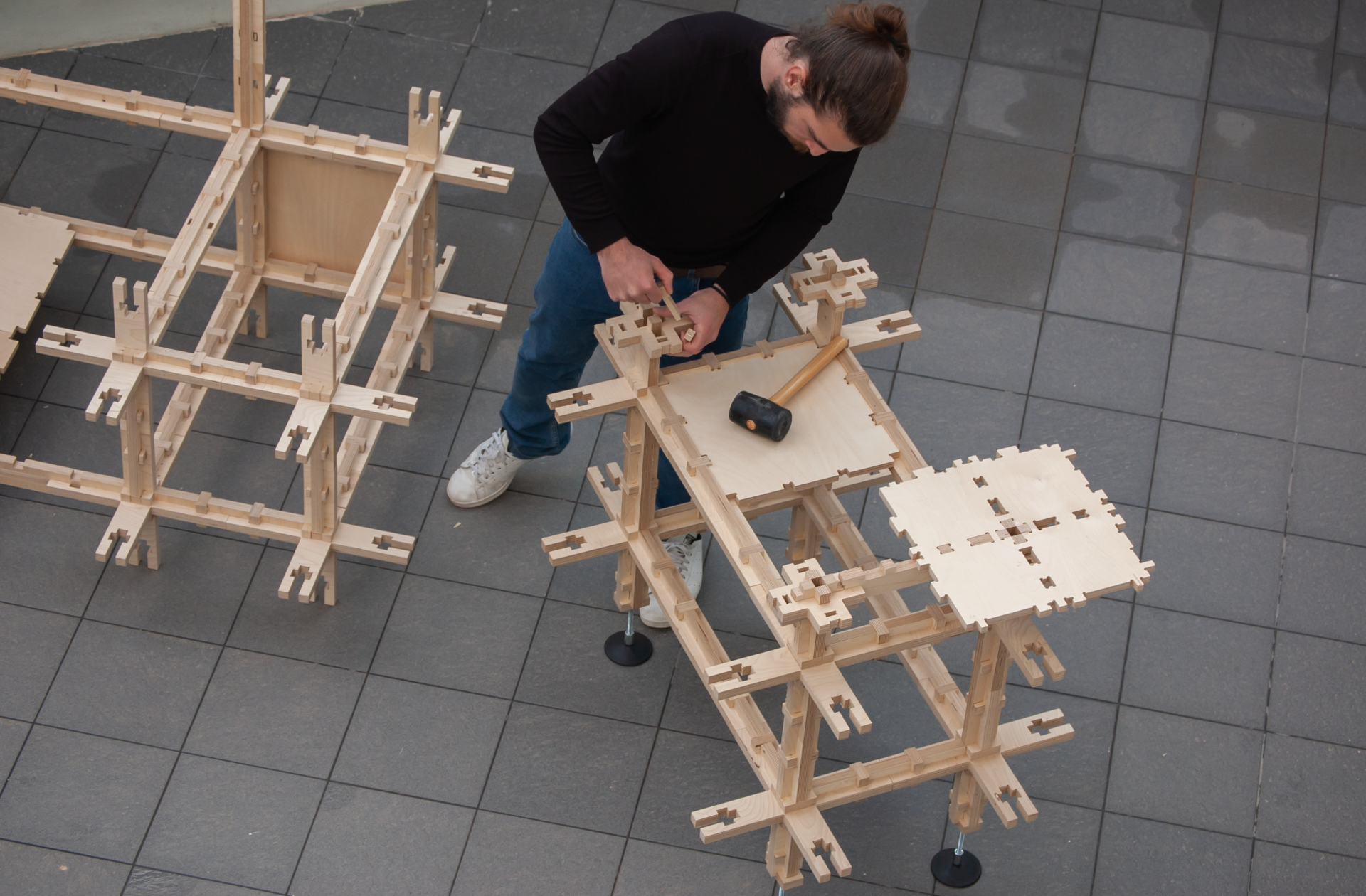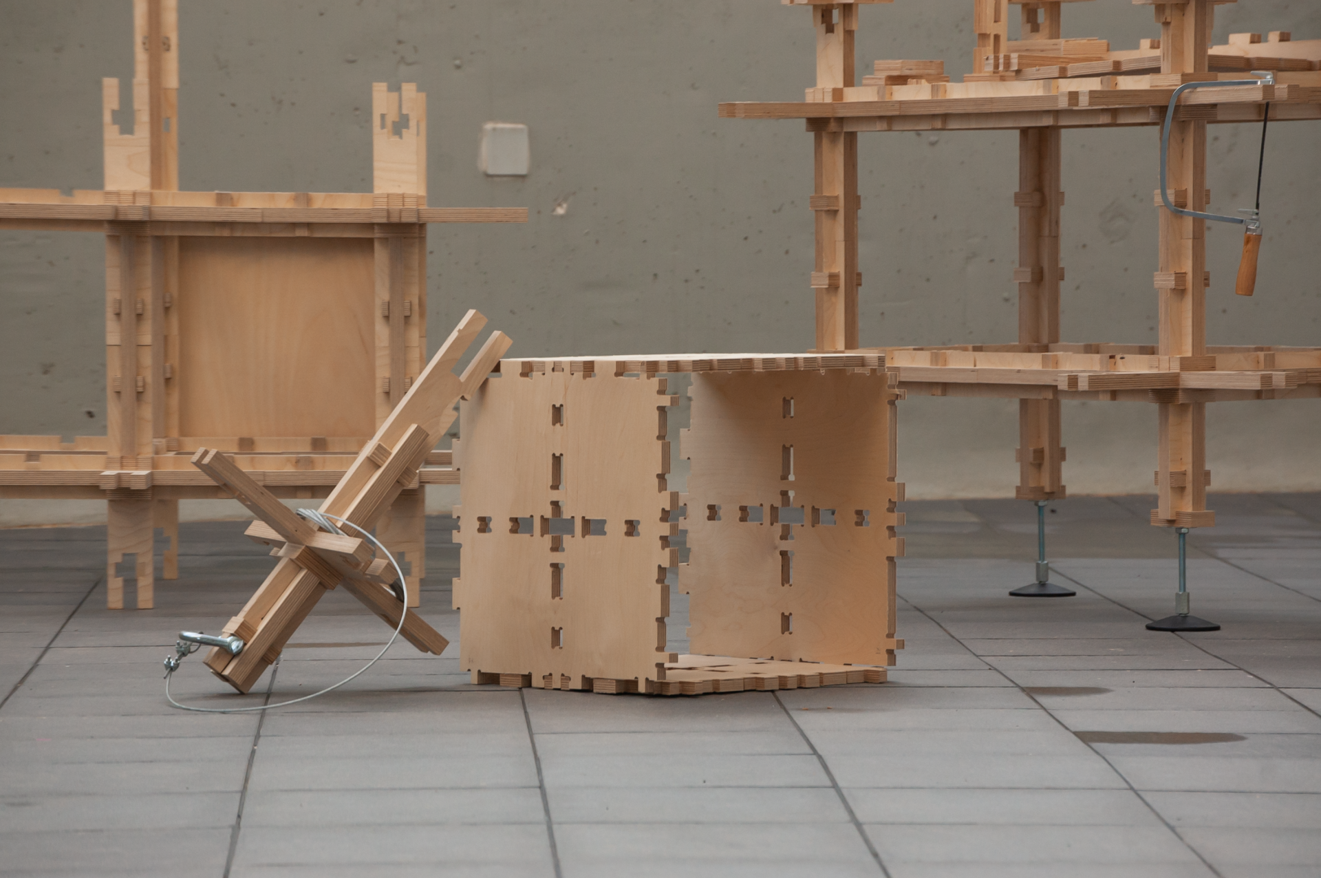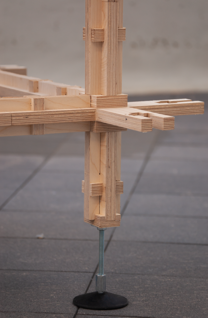 The outcome was an 1:1, small-scale, modular structure that satisfies the majority of the required functions addressed. It is composed of wooden interconnected cross-nodes and beams, cut in the university’s CNC machine, in sizes organized within a grid structure that is proportionate to the human body.