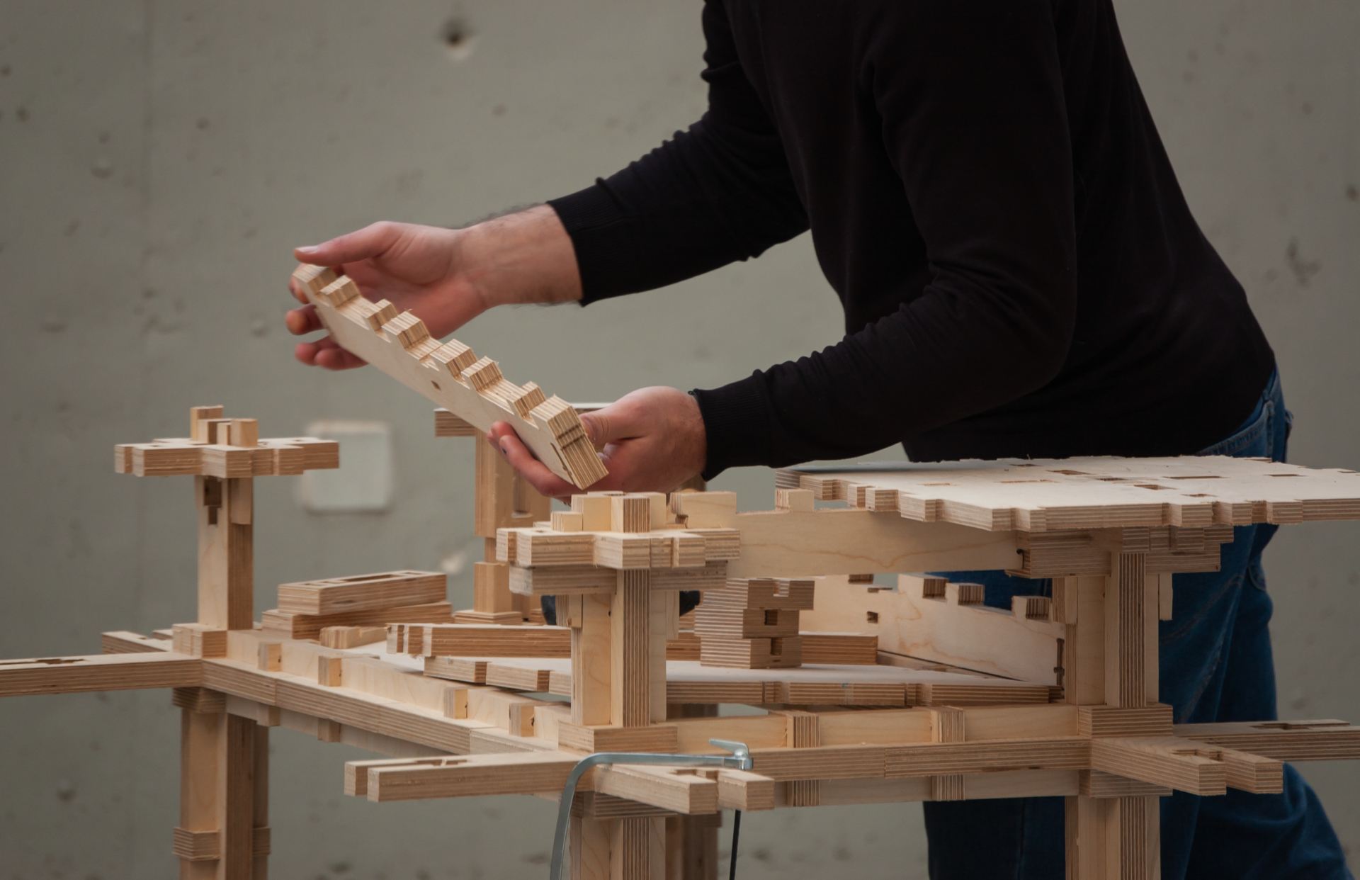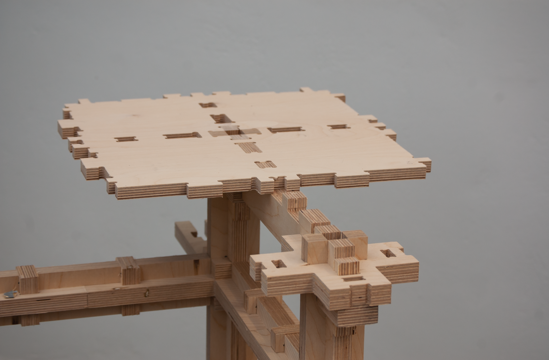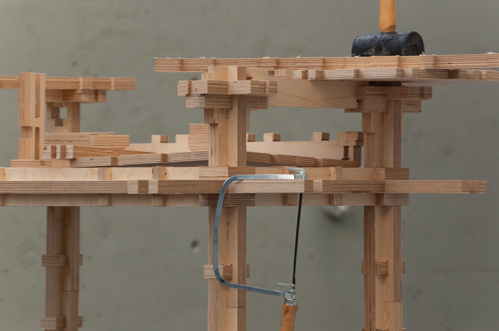In terms of haptics, the system is constructed entirely of plywood, which has a unique and unified visual and tactile result. The core grid serves as the foundation, with a variety of wooden joints connecting other parts together, supporting a 3d puzzle-like assembly process. The students can then use other default surfaces to complete their designs. Any elements that adhere to the grid's proportional dimensions can be integrated into the system.