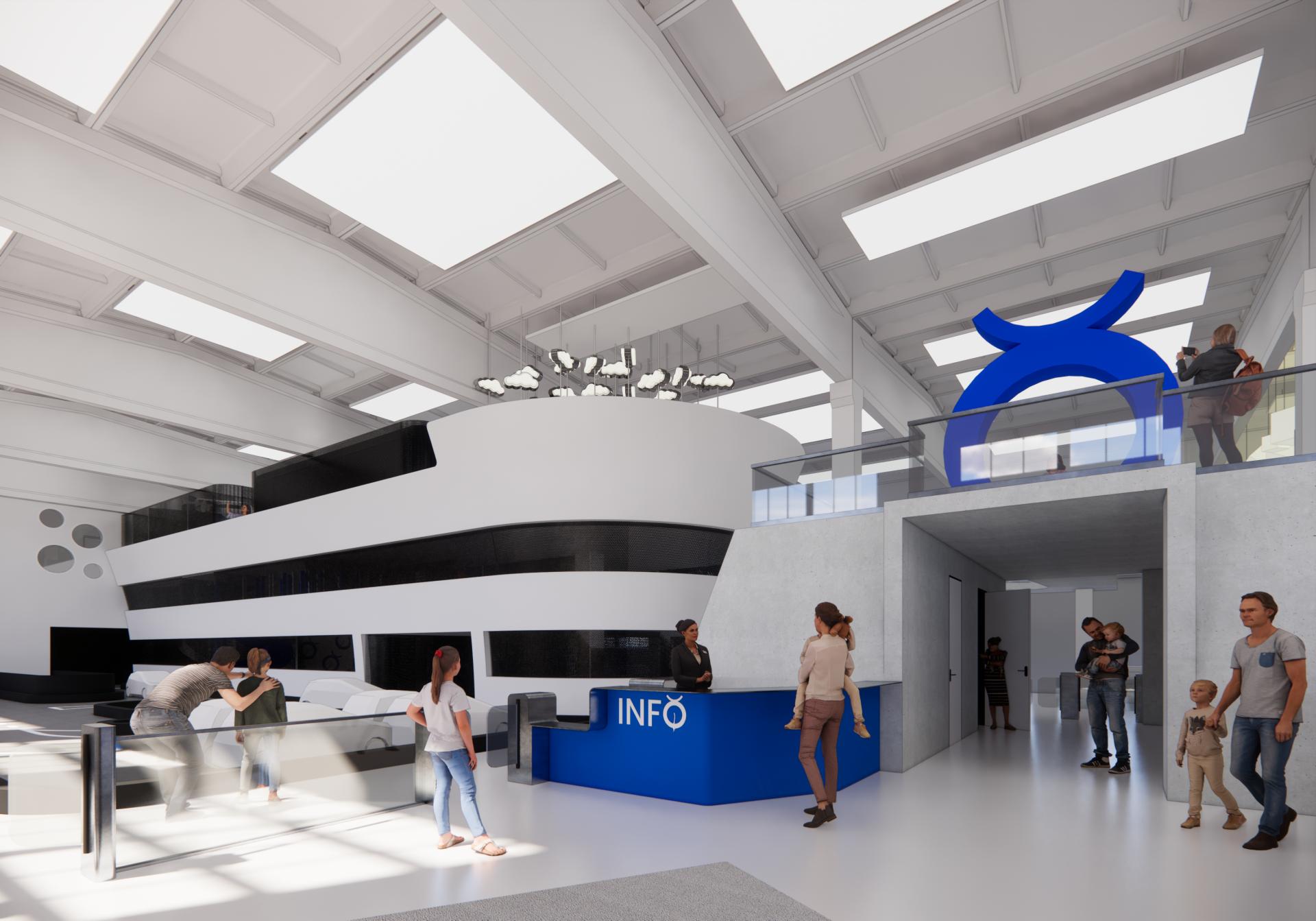 Instead, we wanted to be respectful and as truthful as possible to any visitor of the centre. This has been achieved by maintaining the existing industrial building as a shell and choosing genuine materials sourced or developed locally (glass, metal, concrete) for the design, example of this ideology is the design of the pier element, which in reality would be made of concrete, is also designed to be made of concrete in the entertainment centre, which enables any visitor of the centre to feel the monumentality of a real pier by simply touching it and being next to it. Another example is the ship element, the design of which is a nod to Frank Lloyd Wright’s Guggenheim Museum in New York, and the ship's structure is planned to be made from glass fiber, working with “Latitude Yachts,” a Latvian company manufacturing yachts worldwide.