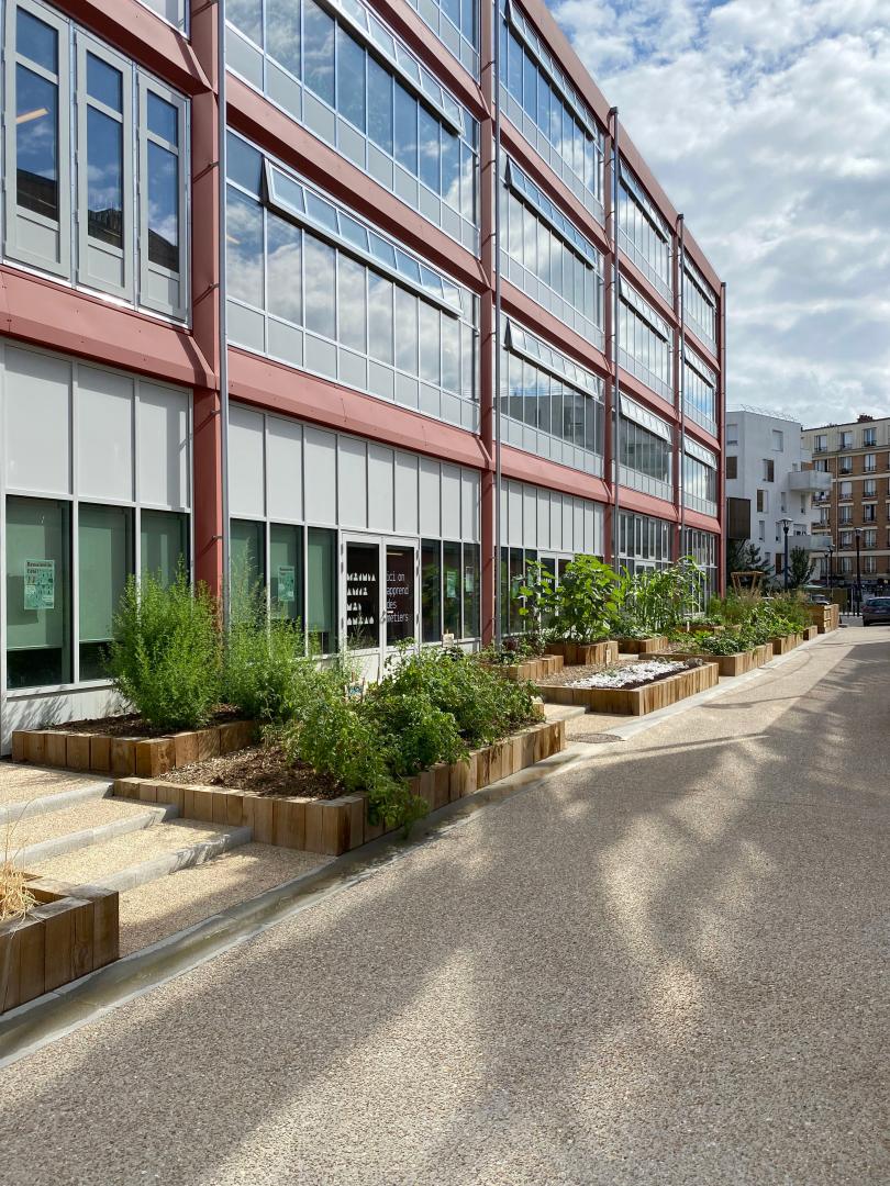 Following the building's completion in March 2021, the first months of the project were devoted to setting up the market gardening and eco-facilitation units: filling the753 planters, sowing and planting, donations of the first harvests to the Secours Populaire charity, direct sales to residents from July onwards, workshops for leisure centres, extracurricular activities and some schools, and the development of outdoor spaces for local residents.