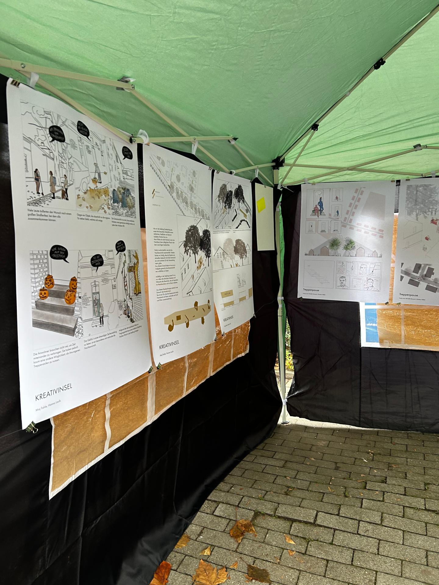 Because the initiative is designed and structured in a participatory manner, they have the opportunity to contribute their wishes, suggestions and criticisms. As already explained, an external planning office "die Stadtdenkerei" was commissioned to enter into an unbiased dialogue with the citizens of the settlement and to start the participation. When "die Stadtdenkerei" started the dialogue process over a long weekend in August 2022 in a camper everything was documented in detail. Citizens voiced their concerns about historic preservation and what they wanted for their settlement. One core element that emerged was that the residents would like to see is a meeting place in the settlement. Based on this wish, a cooperation with the "Münster School of Architecture" was started. A group of students spent an entire semester working on creating a new meeting place for the Dunkelschlag estate. The students came up with a wide variety of designs. The public had the opportunity to participate in the process from the very beginning. In a jury meeting, in which architects and people from the city planning Oberhausen sat, three winning designs were chosen. One of the designs will be built by the students in the settlement and inaugurated together with the citizens.