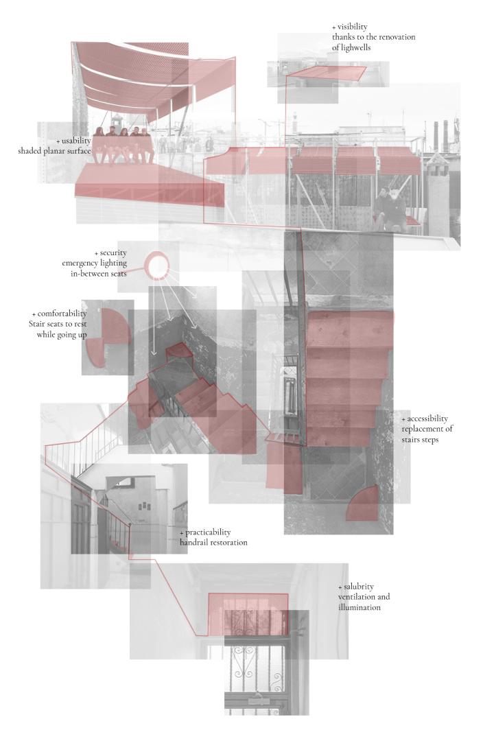 The safety and accessibility of staircases are improved with interventions in steps and railings. The lighting is also improved; energy consumption is reduced using more efficient LED technology, and residents’ perception of comfort and their experience of colour and light are improved. Air quality is improved with greater ventilation through selective openings throughout the building; this also brings in more natural light and provides greater views. This is done in keeping with residents’ desire to dignify entryways and staircases without compromising their privacy. Finally, pollutants and obsolete installations are removed from rooves, and new structures are added to provide a flat surface, additional storage, more shade, greenery and new furniture; this addresses all six conceptual axes.