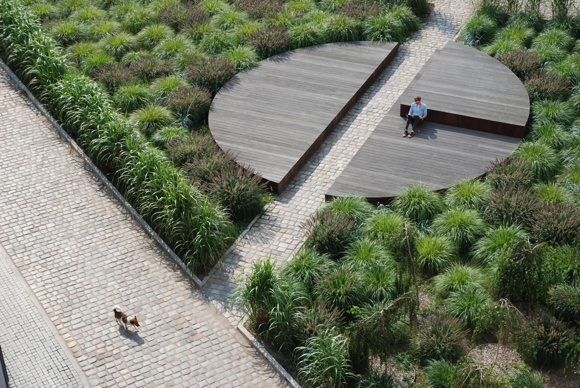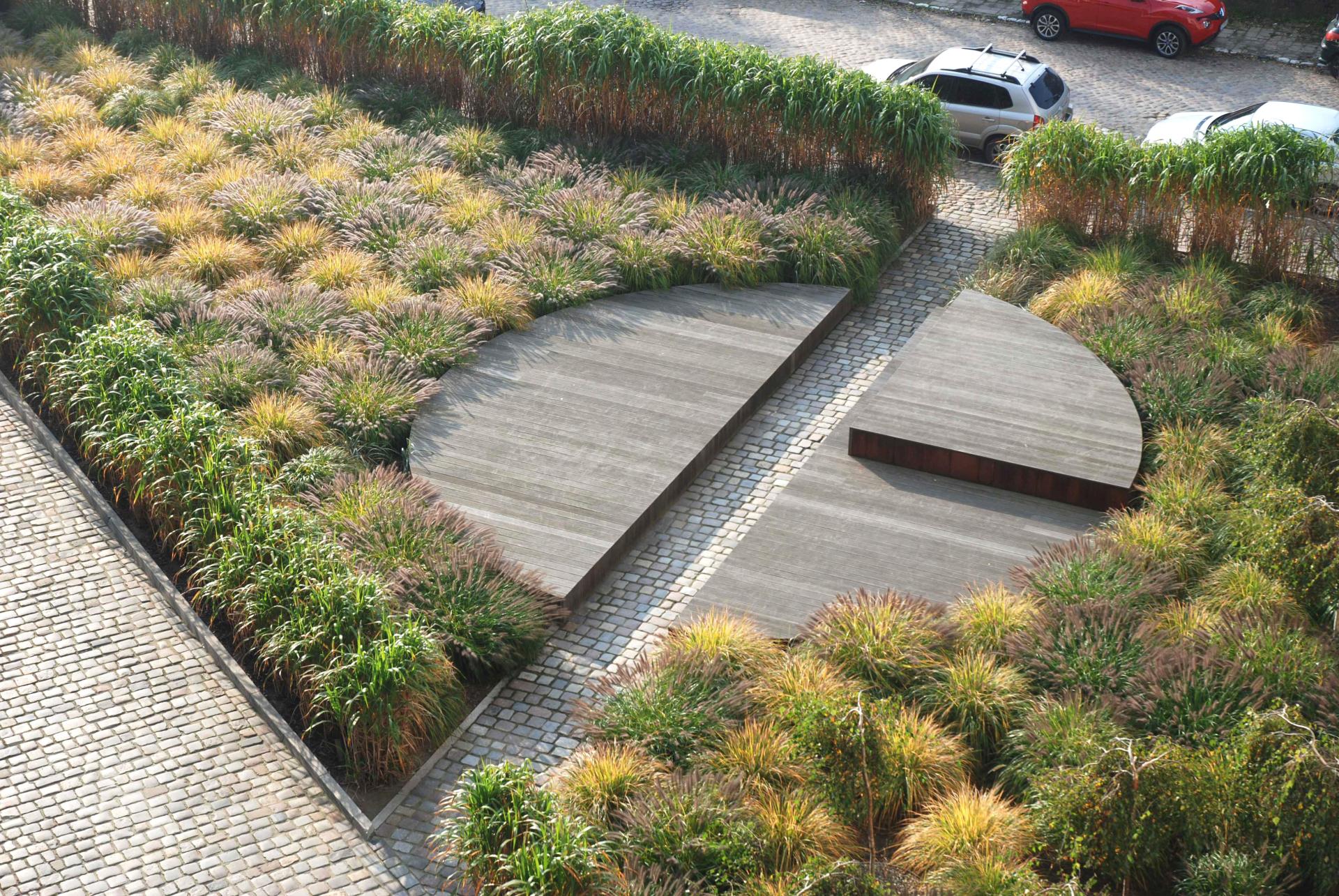 A square design with structural landscaping was created as part of the revitalization of the historic district Chwaliszewo in Poznań, implemented by a the housing cooperative. The circle is a central point of the designed square. This is an example of an open form of urban furniture – not exactly defined, leaving various possibilities for use by inhabitants. The intersection of the circle was necessary to maintain circulation spaces between the buildings and at the same time it plays the traditional function of a municipal bench. In turn, the platform enables lying, organizing picnics – treating this place like a backyard terrace, yet still in the public space.