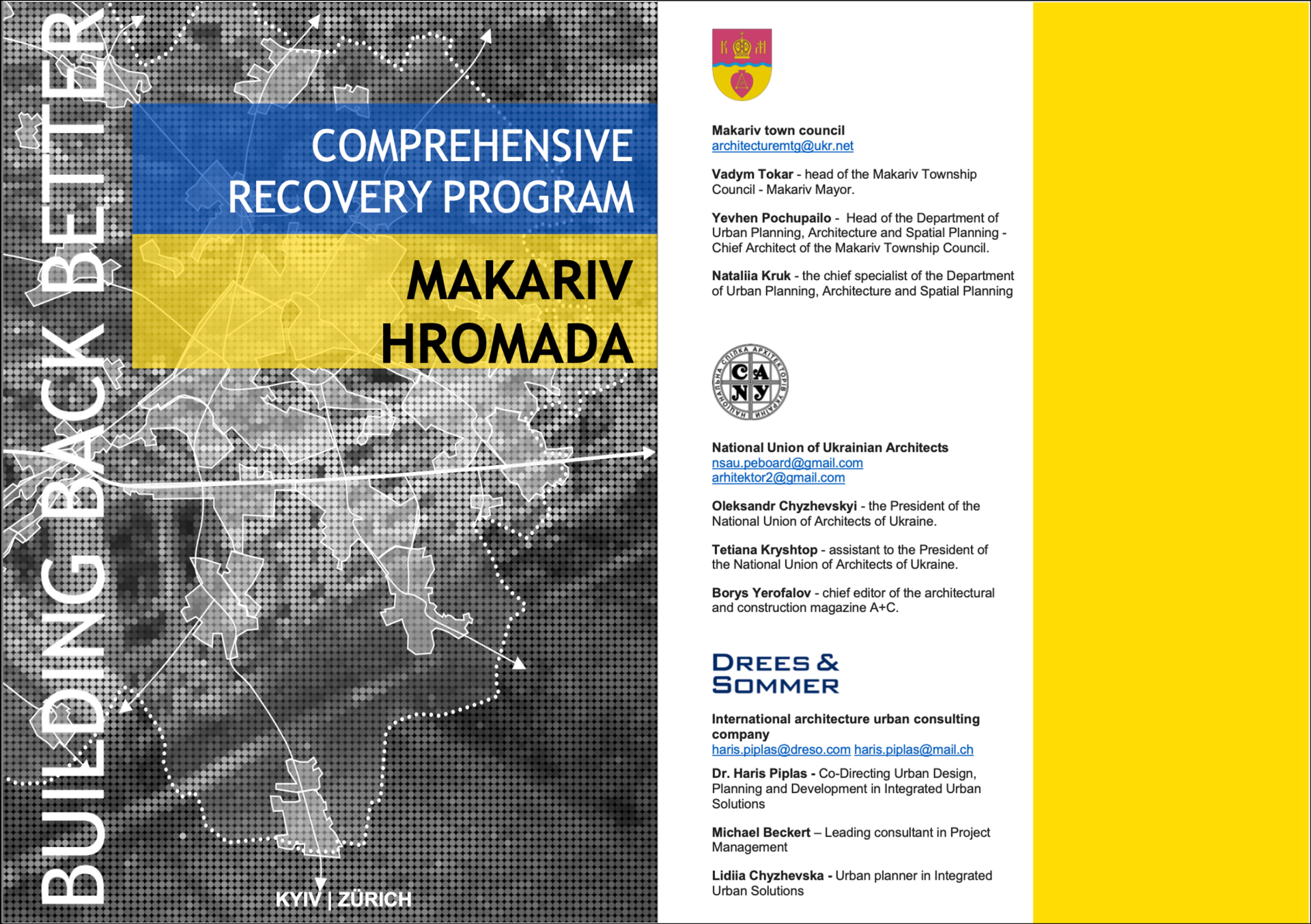 The project is an initiative to establish the methodology for comprehensive urban recovery and renewal of cities and Hromada (Municipality) in Ukraine, based on the international experience of cities post-war recovery and existing Ukrainian legislation. The project emphasizes sustainability, community engagement, and a holistic urban recovery and development approach. The project's primary goal is to plan the holistic restoration and development of Makariv Hromada (as a pilot) sustainably and inclusively, considering the principles and values of NEB. The project aims to engage the entire community by involving various stakeholders, including civil society institutions, local and central government authorities, businesses, international partners, and residents. Specific Objectives include prioritizing the recovery of critical urban infrastructure, exploring the possibilities for urban recovery during ongoing wartime, developing urban area plans and design prototypes for sustainable urban recovery, conducting research and analysis of existing conditions, and creating comprehensive recovery programs in line with international recommendations. The project completed its preparatory and investigation stage by establishing a local team, devising a methodology, identifying intervention areas through data analysis, creating development scenarios, formulating action plans, and promoting multi-stakeholder engagement while adhering to sustainable spatial development principles, European conventions, and legal acts. The project has the potential to be replicated in neighbouring cities in Ukraine. Its outcomes could serve as a model for post-conflict recovery and sustainable urban development in other regions. The project involves capacity building by working with local authorities and partners, creating a hub for discussions, fostering collaboration, and promoting knowledge transfer and capacity building.