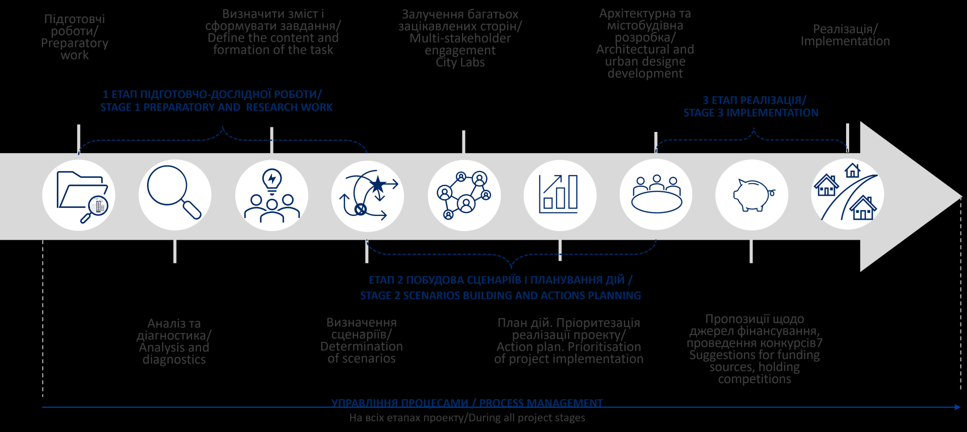 3. Implementation Stage: Prioritizing project implementation with a technical and economic rationale. Development of an action plan with a detailed description of required resources and funding. This approach ensures that the community actively shapes the project's direction, fostering inclusive governance and a sense of ownership. The project also emphasizes the need for transparent project management mechanisms, including financial, governance, coordination, and consultation mechanisms. Project management monitoring and assessment of territory development indicators by the advisory team, including Ukrainian and international experts, is crucial at all project stages. The project's approach consists of a gradual, purposeful, and adaptable process, focusing on recovery, improvement, and long-term development. It also emphasizes capacity-building knowledge transfer.