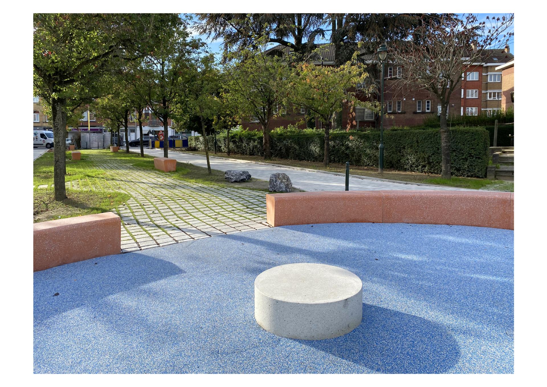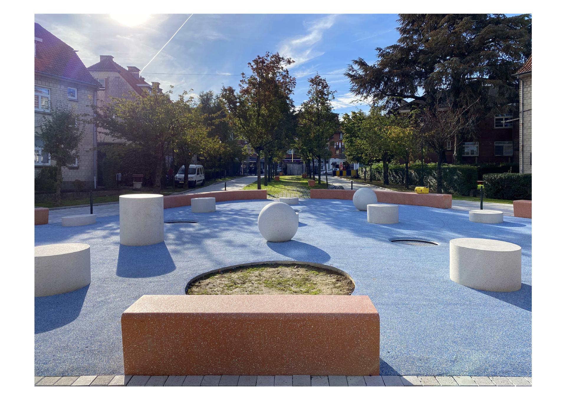 Themed squares act as focal points for activities and leisure, featuring dense vegetation and urban furniture tailored to meet the expectations of each user. The projects prioritize strong rainwater infiltration to minimize contributions to the sewer system by proposing numerous densely planted areas in public spaces. In this regard, over 1000m2 of open ground and nearly 3000m2 of semi-permeable surfaces are created, and 56 new tall trees are planted.