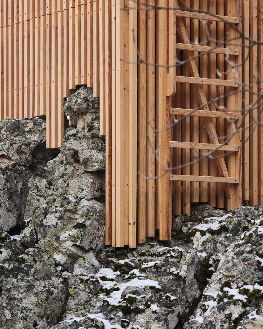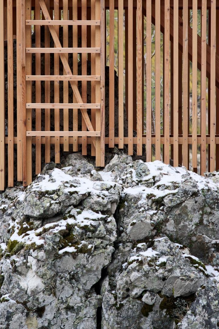 Each pavilion is adapated to its close and far environnement and has slatted walls that prevent the deer from seeing the people inside. Their bases are unevenly finished, where the slats extend down to slot precisely over the rockface, and echo the appearance of undergrowth