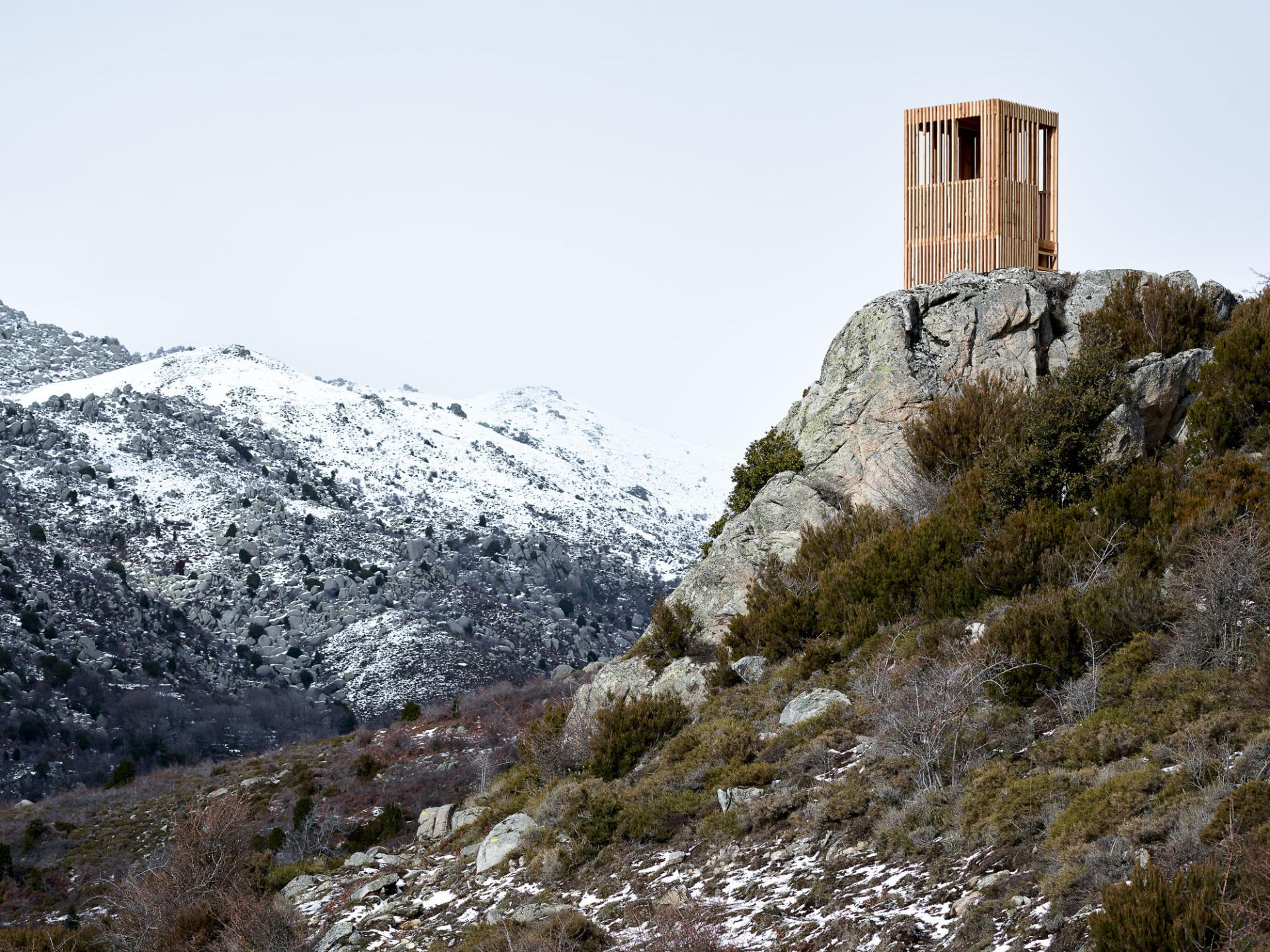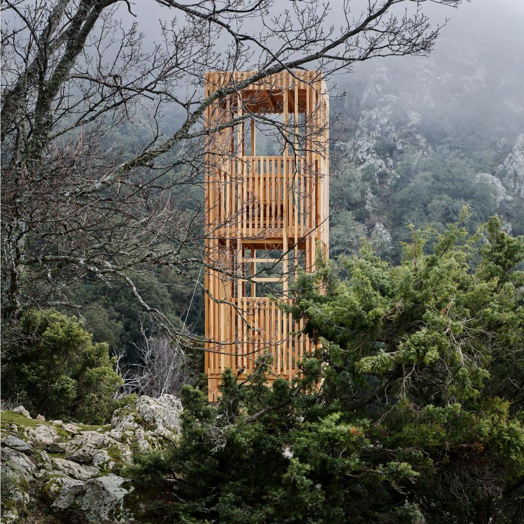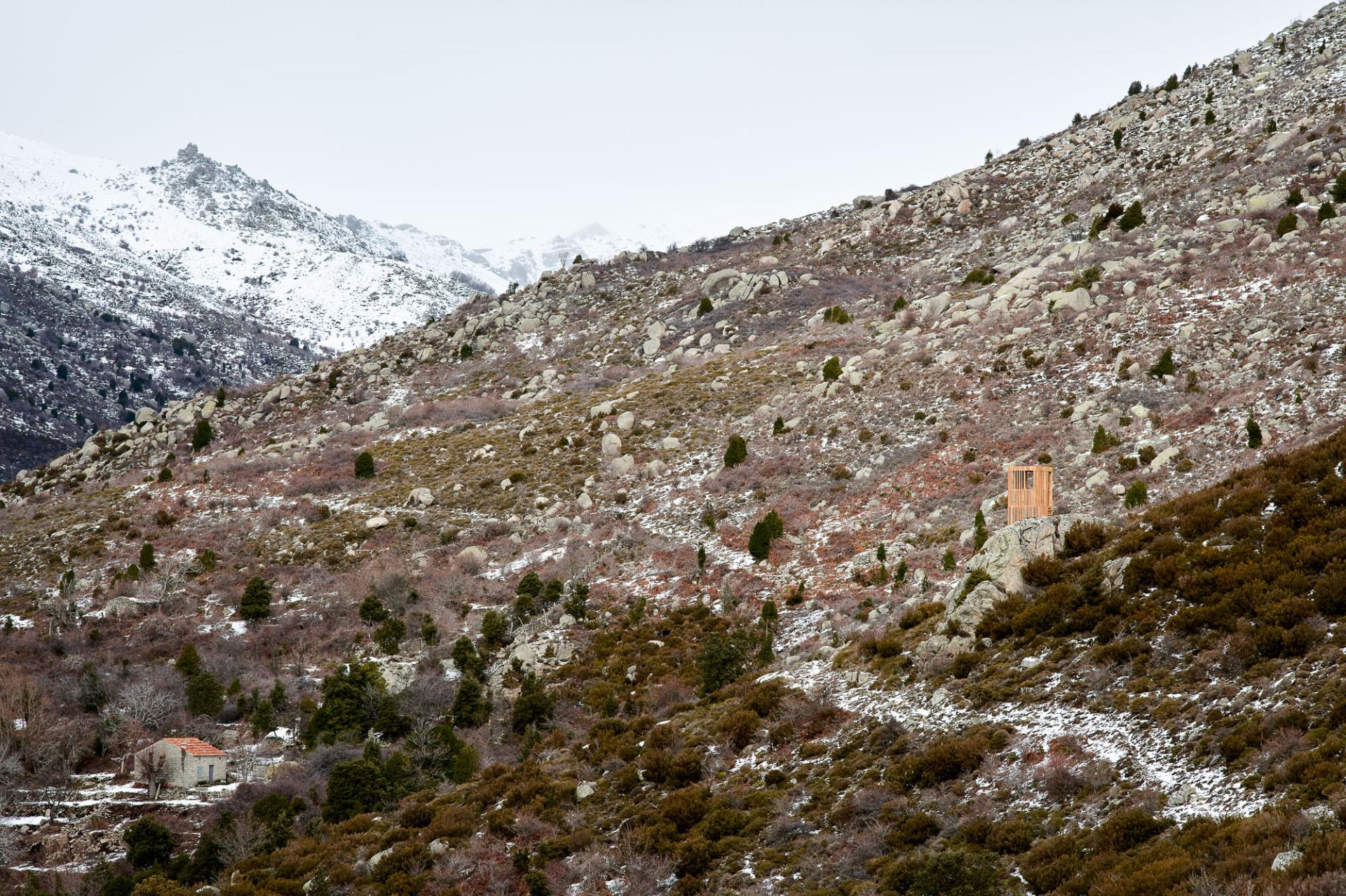 The modest observatories, are located in the moutains of Regional Park of Corsica, scattered in three distinct areas: Venaco, Castifao and Quenza. Made of local wood (« Laricio » : andemic pine), they unveils an architecture at the service of nature. As evidenced by the interplay of shadow and light crossing the wooden slats, the project aims at blending into the landscape without actually disappearing.