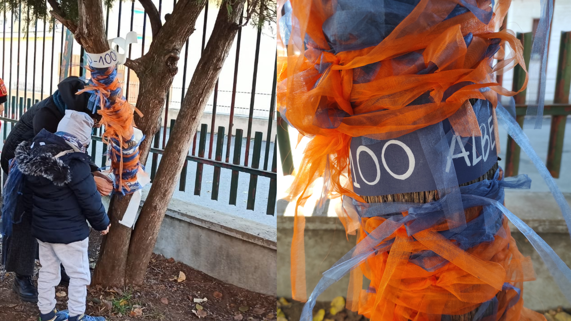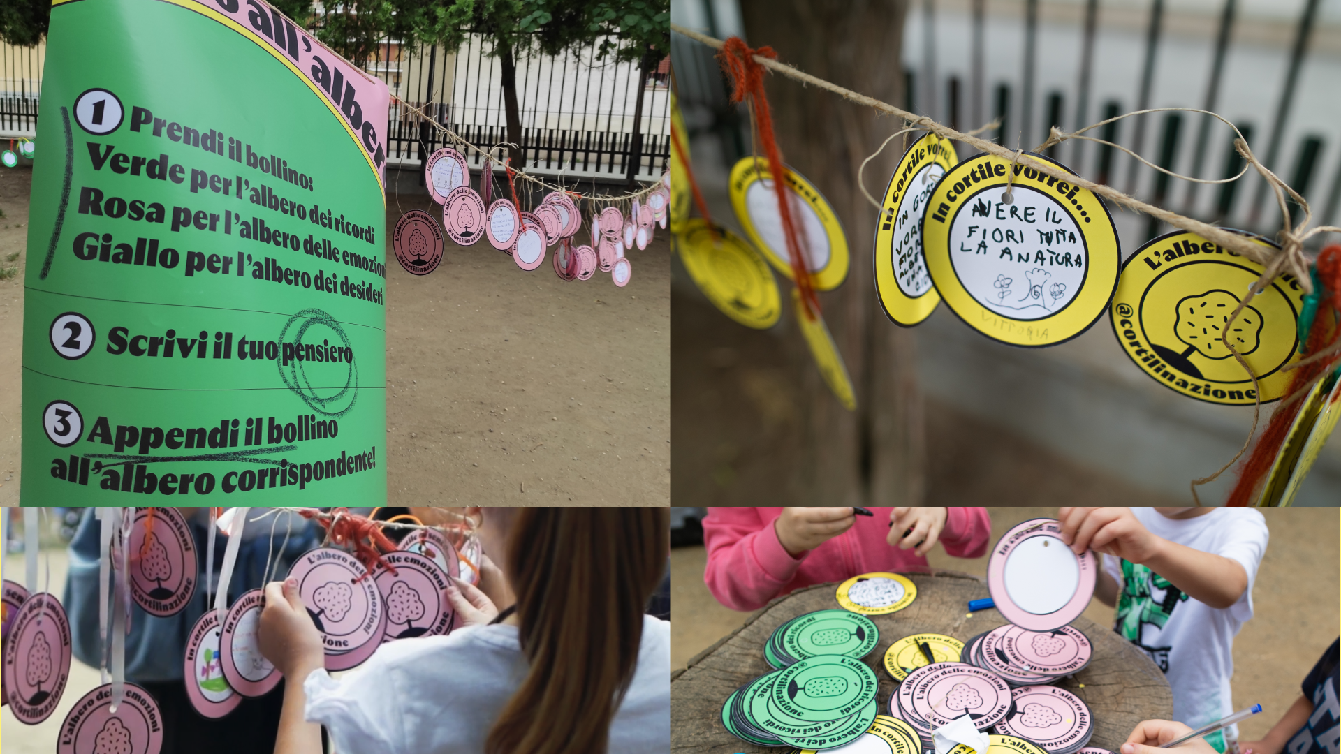 The Participatory Data Physicalization (PDP) sessions were also characterized by attention to communication and beauty. PDP, an emerging field related to data visualization, involves materializing data, often in public spaces, making it tangible and alive. In Cortili in azione, PDP sessions were used to show the results of children's discussions on climate and social issues in their daily lives. The responses were not verbal, but recorded as decorative elements in the schoolyard, such as fabric around trees, flags, planted flowers, and coloured stamps. These visual representations served as both a reflection of the discussions triggered by the PDP sessions and a warning of the issues raised.