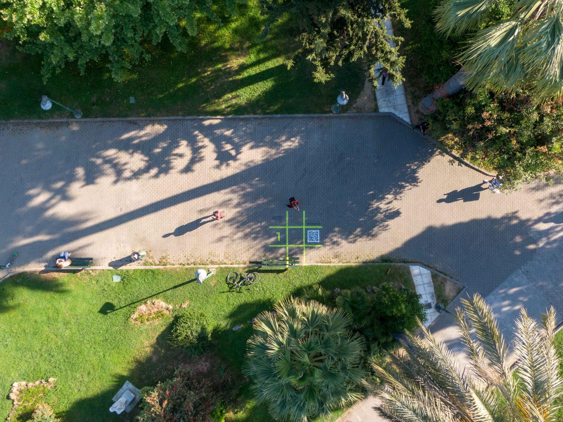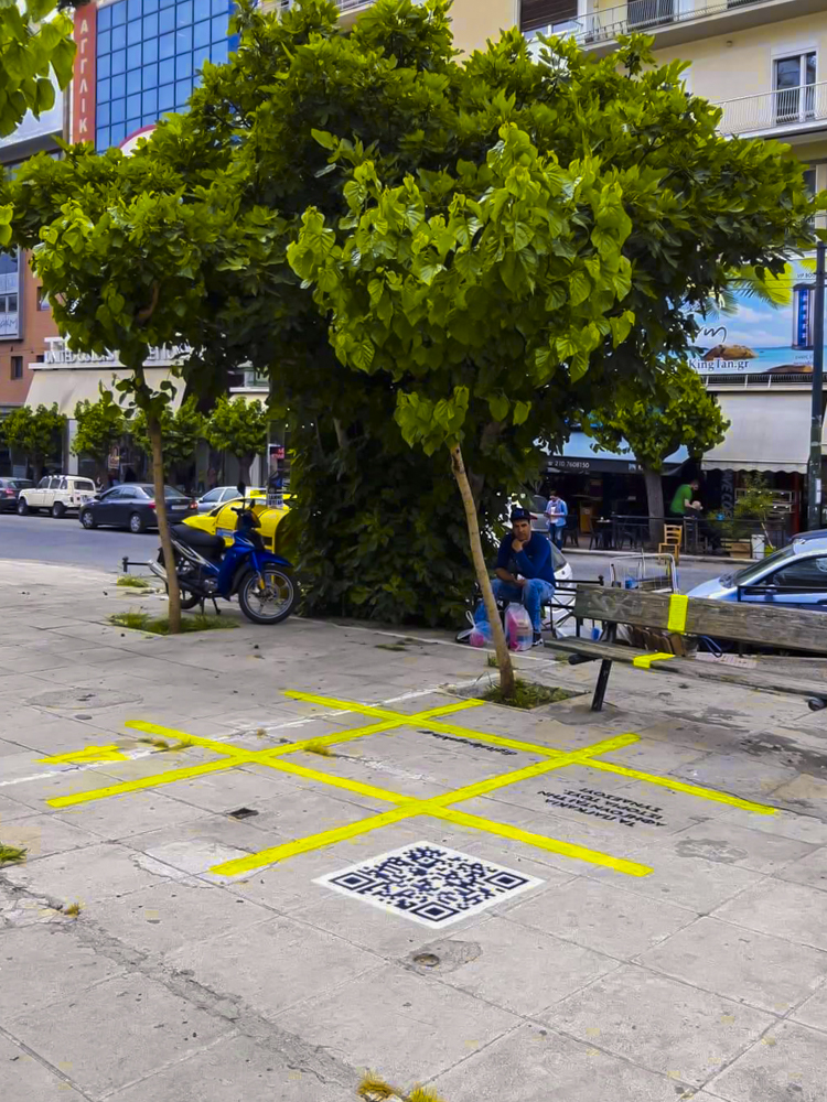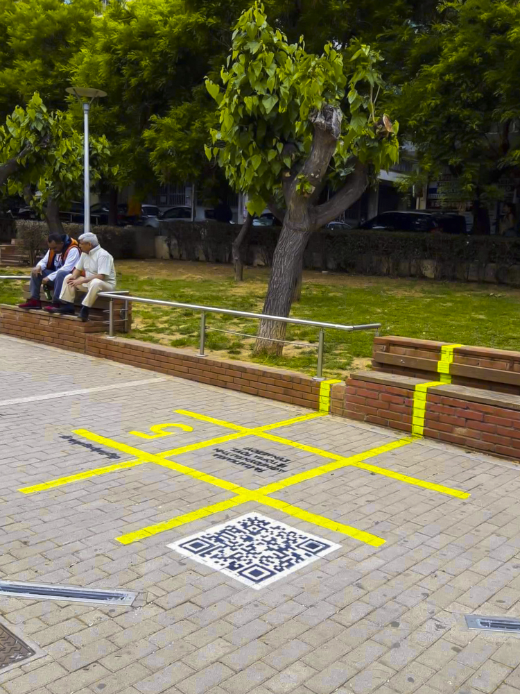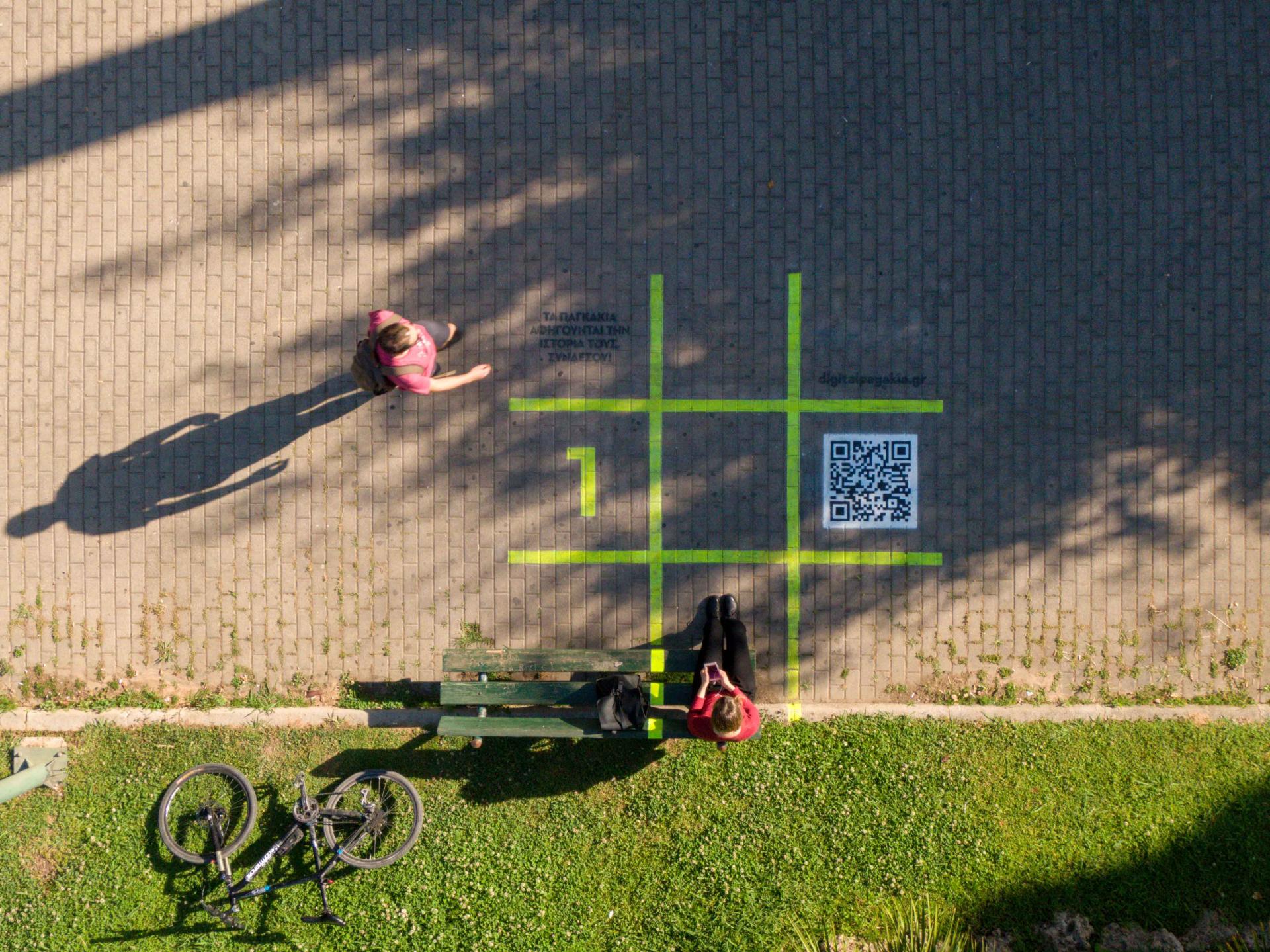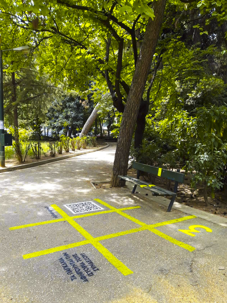Through the online platform www.digitalpagakia.gr we aimed to gather those stories told while sitting on benches and to create a rich digital library while offering a fun experience to the citizens. The digital benches are recognizable through the visual imprint of the tic-tac-toe, painted with the stencil technique around and on the selected benches of the intervention, together with the accompanying text "The benches share their stories, Connect!", the website "digitalpagakia.gr" and the QR code that links directly to the intervention’s website. The tic-tac-toe was chosen to mark the visual identity of the project as it is a traditional game that is participatory and simple to use. So, what happens at the bench?