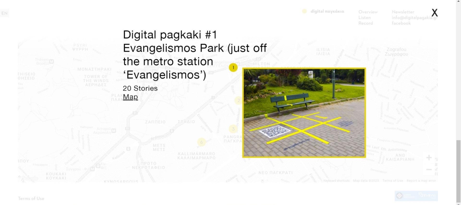 The online platform www.digitalpagakia.gr aims to gather everyday life stories told while sitting on benches and to create a rich digital library, a ‘storytelling museum’ in the heart of the city. With the use of their smartphones, citizens can scan the QR code found on the pavement or simply visit www.digitalpagakia.gr. The user-friendly webpage’s design directs them to the easy steps of listening and recording stories. In the home page there is a map depicting all selected benches at the city center. By clicking on the benches, citizens can get exact directions powered by Google maps.