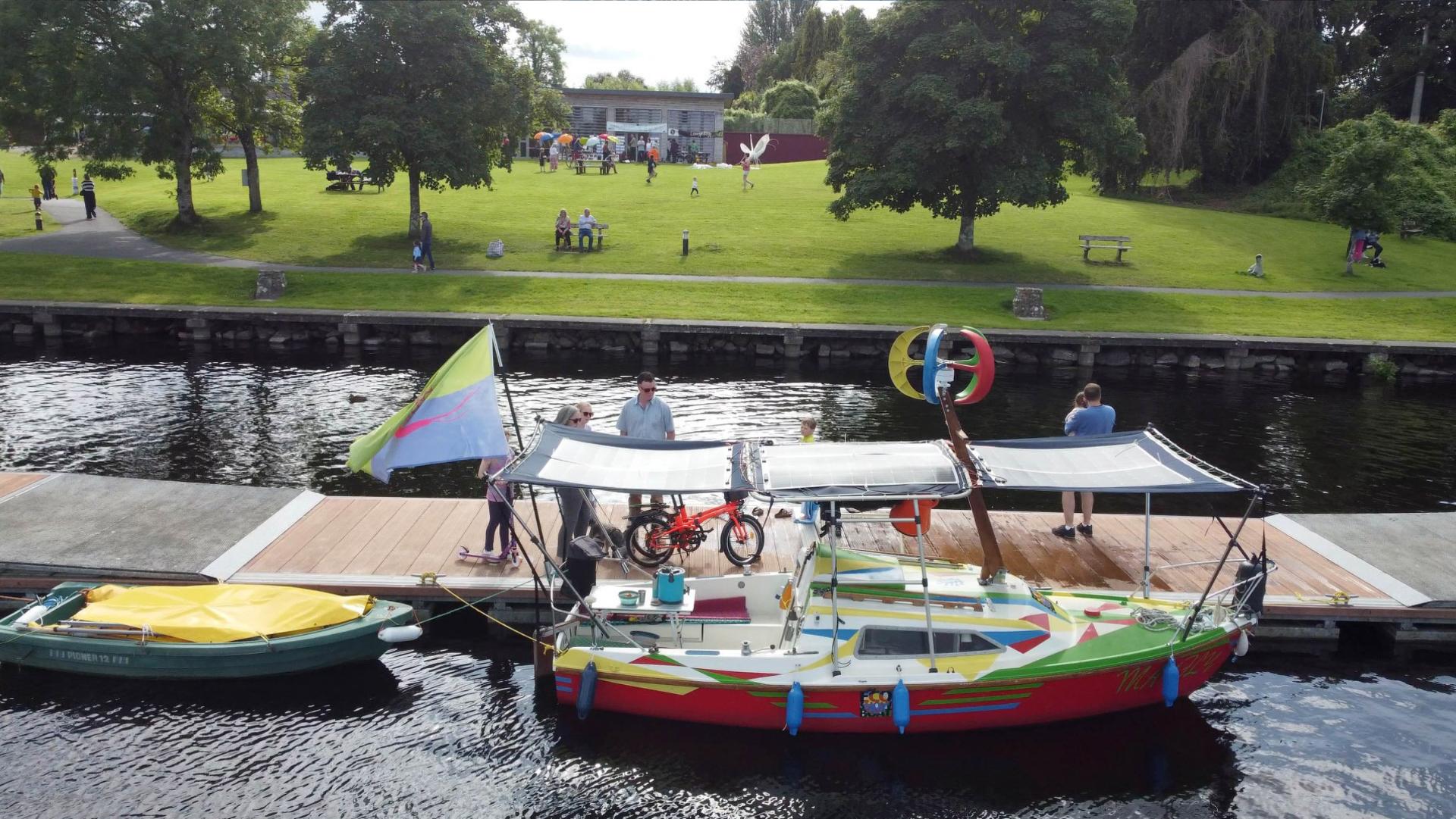 The Eco Showboat, a solar powered electric boat and floating work of art, toured the Irish rivers and canals for two years, criss-crossing the Irish midlands, connecting artists, scientists and communities with the aim of sparking widespread environmental action through artistic creation, trans-disciplinary collaborations and science workshops.