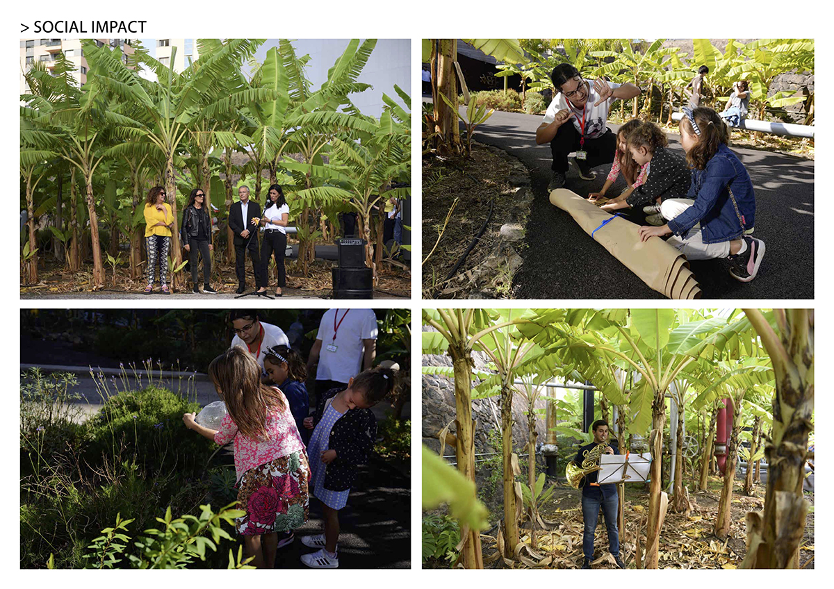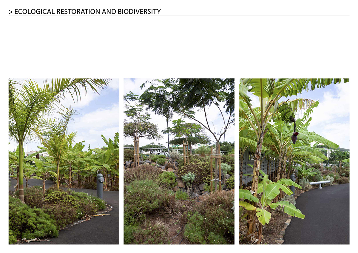 The architectural project pursues the ecological restoration of the site and, to this purpose, after an investigation on the activity that existed in the place before its industrialization, it was decided to plant an orchard of banana trees and local plants, typical of the coast of Santa Cruz de Tenerife, naturally adapted and resilient. and