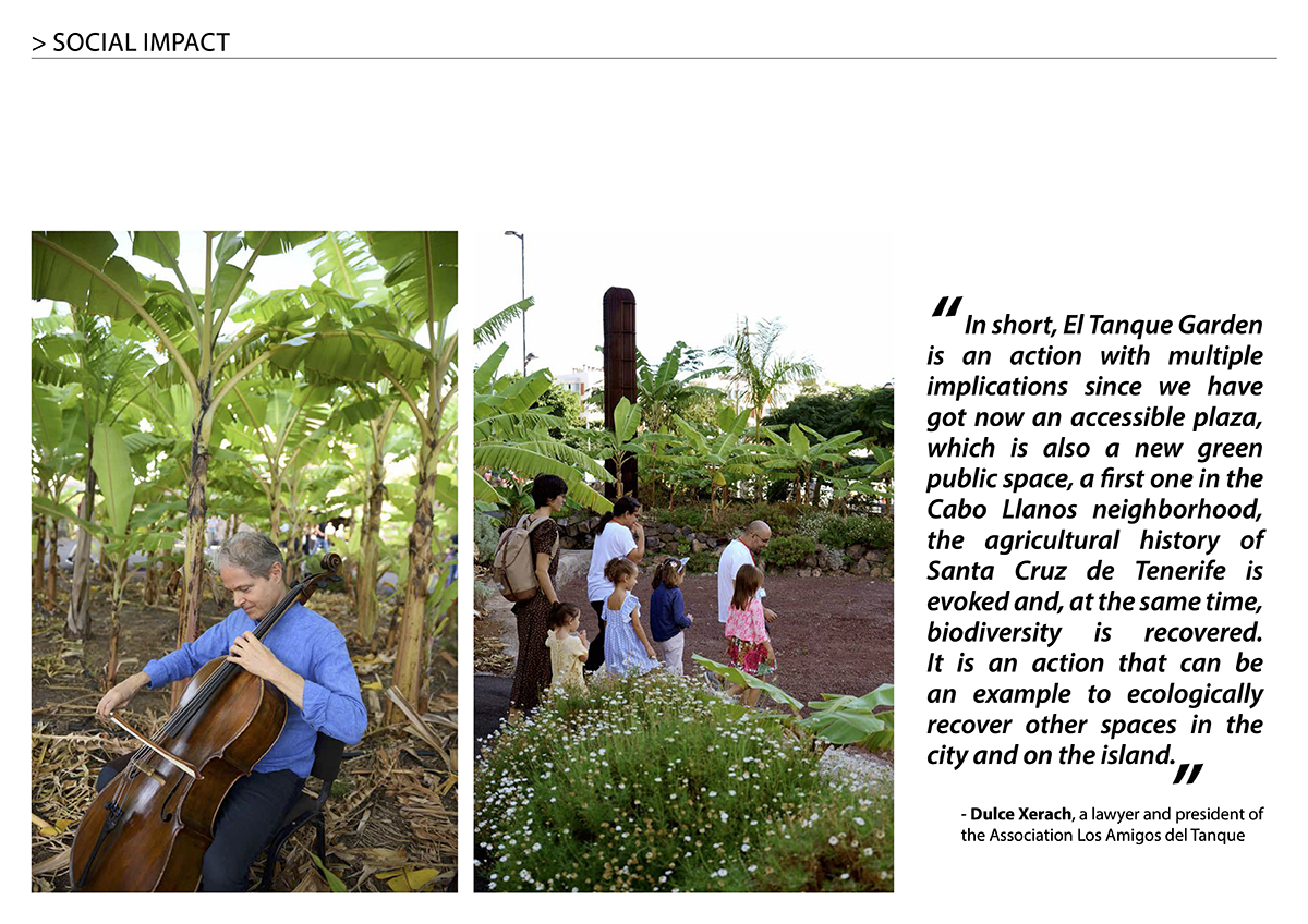 The El Tanque Garden is a public space, which can be enjoyed freely and free of charge by anyone. It provides equal opportunities for the inhabitants of the Cabo Llano neighbourhood as it guarantees the access to nature for people living in a heavy urban area, which completely lacked public green areas before the Garden was built. (Article in local media: https://bit.ly/3RoIPY7)