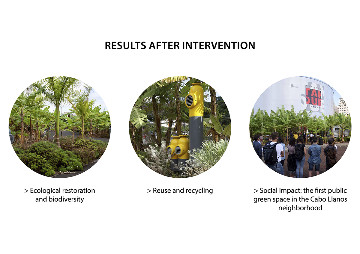 An ecological restoration project in a formerly industrial area that provides the Cabo Llanos neighborhood of Santa Cruz de Tenerife with its first green public space. This banana trees and endemic plants garden that surrounds a former oil tank, reused as a cultural space since 1997, recalls the agricultural landscape prior to industrialization, staging the city as a place of coexistence for diverse cultures and sensibilities that shape the identity of the city.