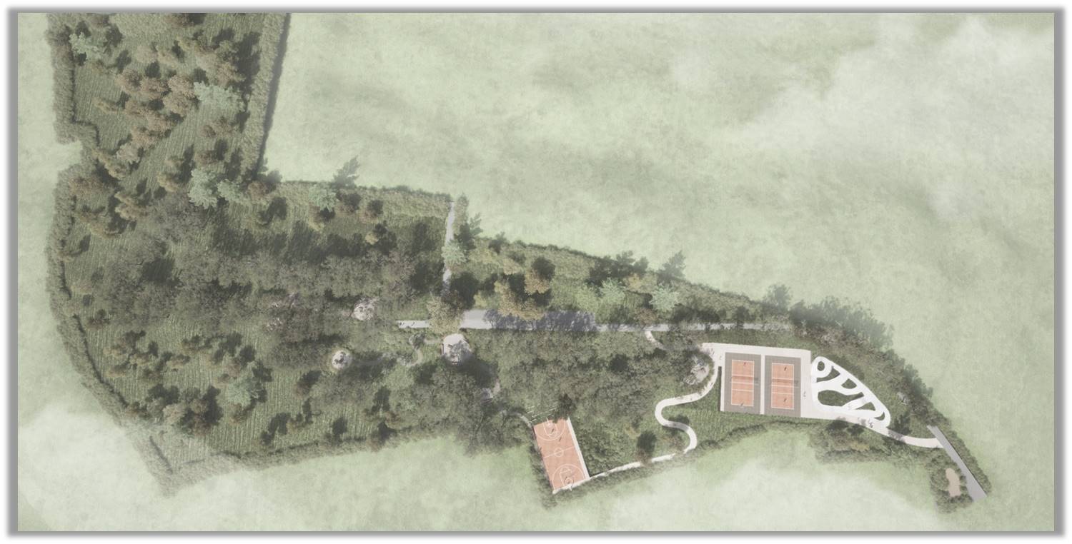 In the eastern part of the site, earthen terraces have been planned to ensure easy access for all age groups, as the topographical and geotechnical data allow. It was also important to have enough space to correctly position the outdoor sports facilities taking into account the movement of the sun during the day. A thorough photographic survey of the existing trees was carried out and the project considered the preservation of all trees.